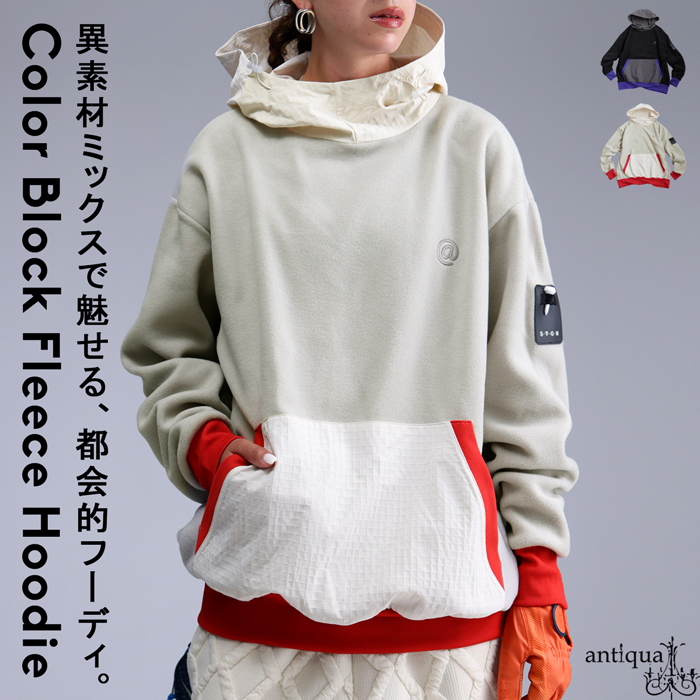 遊び心を効かせた配色切替が魅力のフード付きフリース。