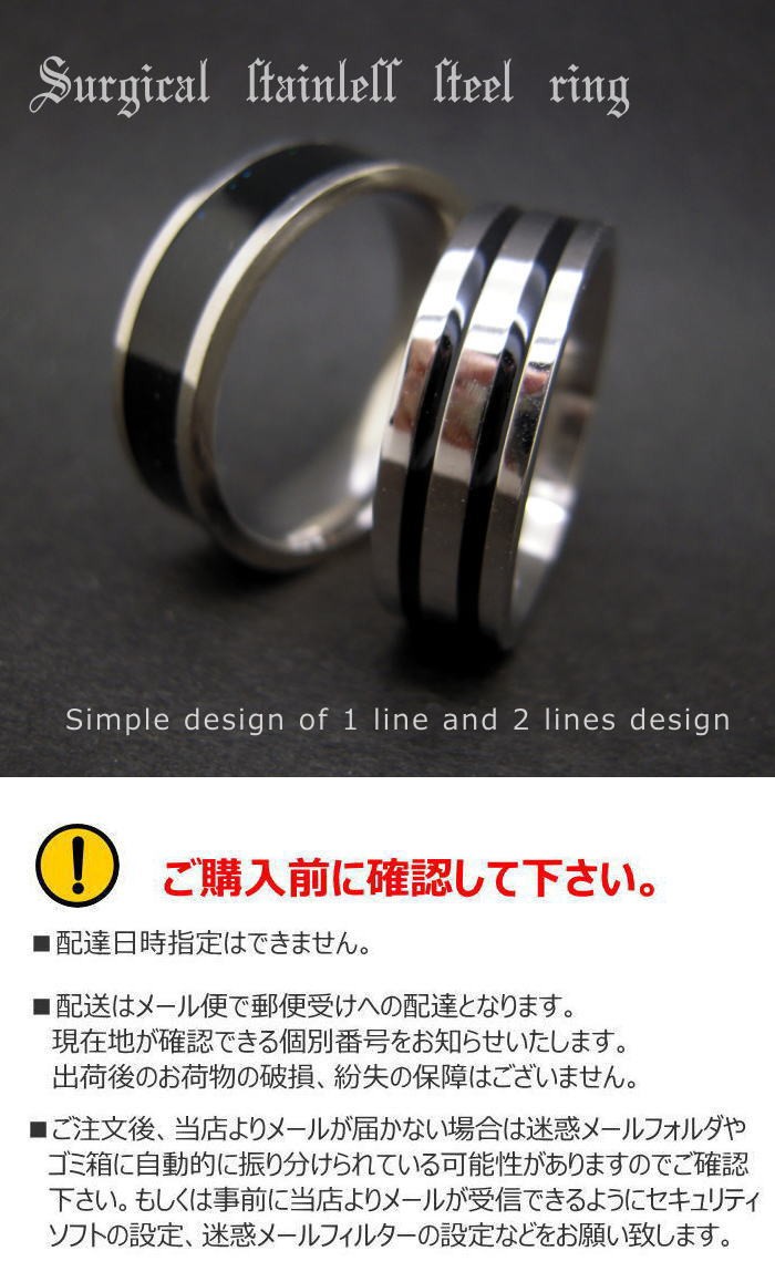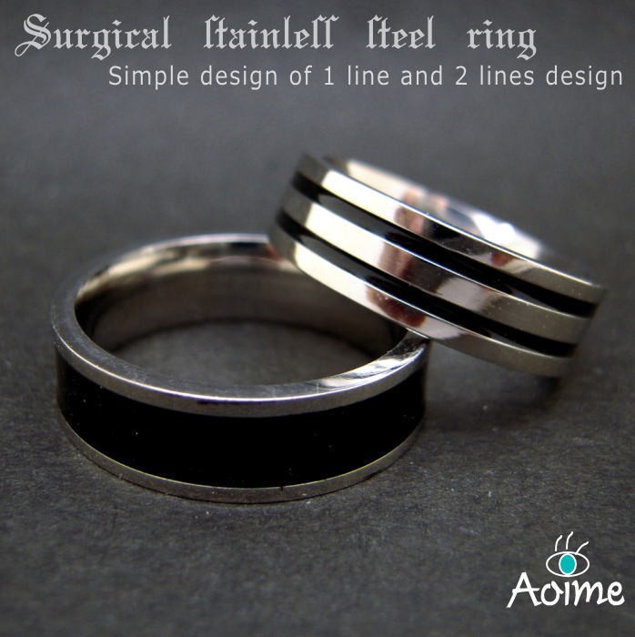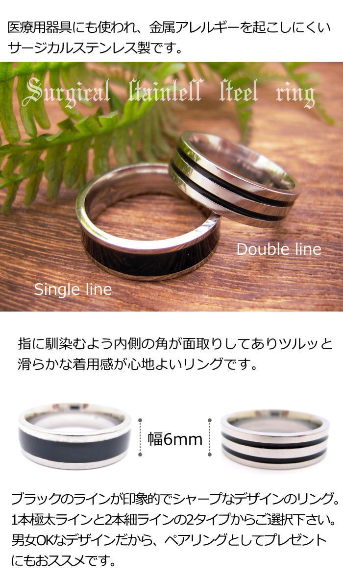 医療用器具にも使われ、金属アレルギーを起こしにくいステンレスリングにブラックのラインが印象的でシャープなデザインのリング。