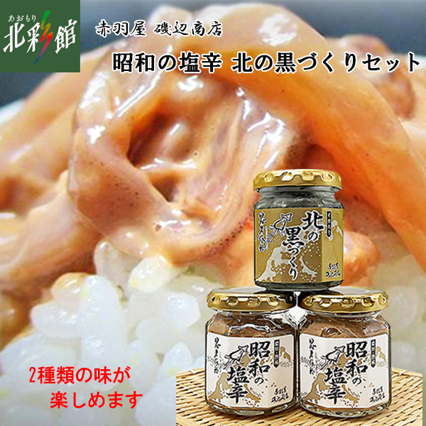 | 内容量 | 3本入(瓶入り) ●昭和の塩辛 100g×2本 ●北の黒づくり 100g×1本 |