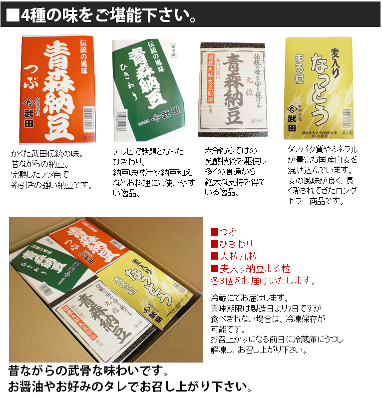青森、青森県、青森県産、あおもり、アンテナショップ、青森県アンテナショップ、青森アンテナショップ、飯田橋、アオモリ、お中元、御中元、御歳暮、お歳暮、贈り物、母の日、父の日、敬老の日、子供の日、贈答、御礼、お礼、お祝、御祝、産直、直送、青森県産、青森納豆、納豆、つぶ、大粒、丸粒、ひきわり、ひきわり納豆、国産納豆、麦入り納豆、ご飯、ごはんのおとも、ご飯のおとも、ご飯の友、ご飯のお友、詰合せ、納豆詰合せ、かくた武田、伝統、昔ながら