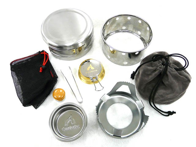 Gaobabuステンクッカー700ml(フタ付) + 固形燃料トレー + Gaobabuアルコールバーナー 火力調整・消火フタ + 五徳ベース + 五徳ベース収納用きんちゃく袋 + 五徳ベース用風防 + マグネットつまみ + ミニトング + メッシュ収納袋 以上9点のお得なセット販売です。