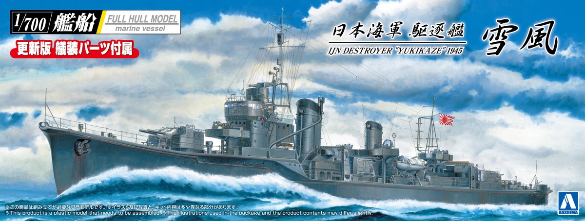 アオシマウォーターラインシリーズでお馴染みの更新版艤装パーツを1/700フルハル艦船にも追加。開戦と同時に南方作戦に参加。その後もガ島撤収作戦、レイテ沖海戦等々様々な激戦を戦い抜き、戦艦大和の最期も見届けました。本キットでは対空戦闘を意識し、機銃を増設した戦争末期の「雪風」を再現。12.7cm連装砲や25mm機銃等武装を中心に各種艤装パーツを更新。