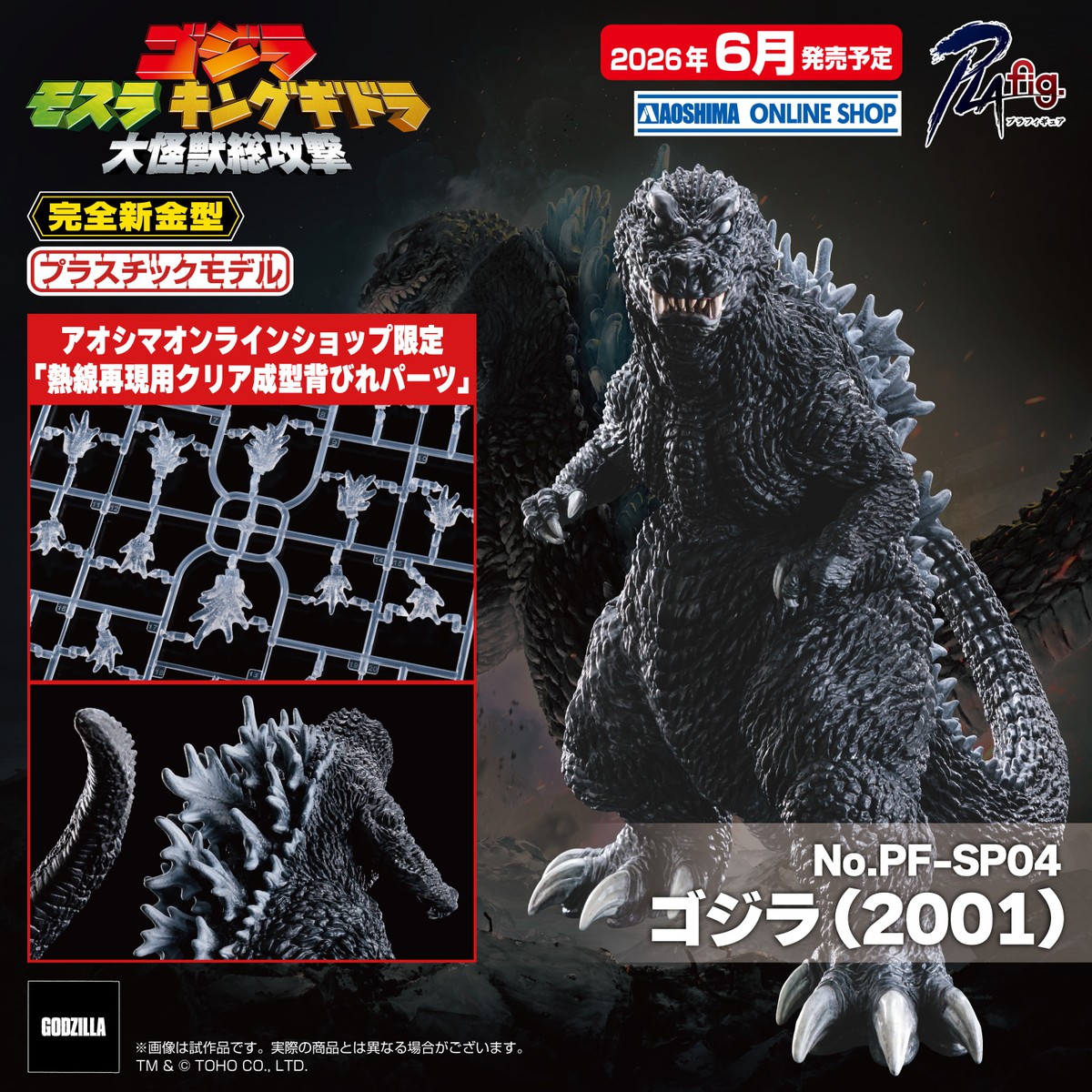 圧倒的な造形プラモデルを目指す新生ブランド「PLAfig. (プラフィギュア)」より、『ゴジラ モスラ キングギドラ 大怪獣総攻撃』に登場した「ゴジラ (2001)」が登場。原型制作には引き続き「RYO ねんど星人」氏を起用し、シリーズ屈指の凶悪さを誇るゴジラ (2001)の姿を固定ポーズでプラモデルキット化しました。造形を損なわない設計により、組み立てるだけでゴジラの造形美をお楽しみいただけます。また、おまけ特典として劇中ラストに登場したゴジラの心臓が付属。ゴジラ (2001)と並べて飾ることができる仕様となっております。オンラインショップ限定版には、クリア成型の背びれパーツランナーが追加で付属。パッケージイラストは「TAKA-F」氏による描き下ろしの豪華仕様。パッケージアートとしてもゴジラの迫力をお楽しみ頂けます。怨念の集合体により恐怖の怪獣王となったゴジラ。360°造形にこだわった最恐のゴジラを、是非お手元で組み立ててご堪能下さい。