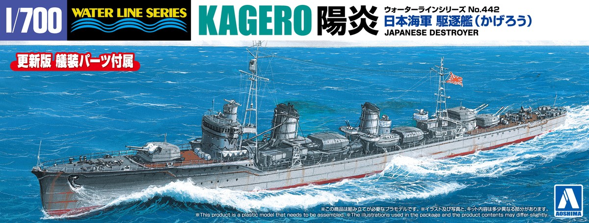 日本海軍の標準的な駆逐艦であり、多くの海域で活躍した陽炎型駆逐艦のネームシップ「陽炎」を1/700スケールでプラスチックモデルキット化。要点を抑えたパーツ構成で、シンプルで組み立て易く、かつ的確に再現できます。12.7cm連装砲や対空機銃、艦載艇などの各種艤装を新設計で追加しました。