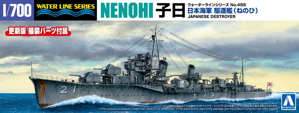 条約下の厳しい制限のもと建造された初春型駆逐艦「子日」を日本海軍内でも異彩を放つ独特な就役当時の姿で1/700スケールのプラスチックモデルキット化。要点を抑えたパーツ構成で、シンプルで組み立て易く、かつ的確に再現できます。魚雷発射管、装載艇など各種艤装を新設計で追加しました。1/700スケールの精密感や緻密さをうまく表現しています。