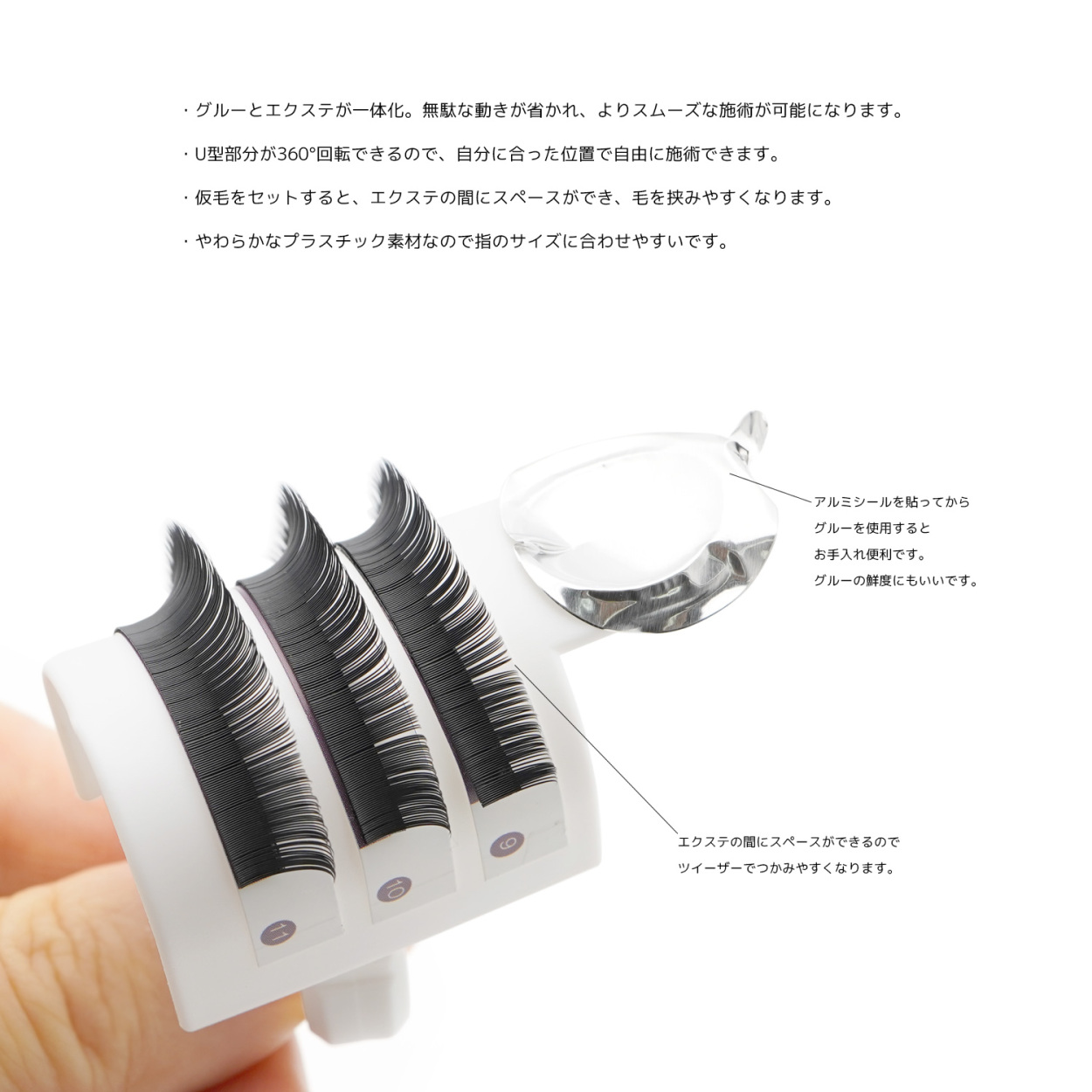 ・グルーとエクステが一体化。無駄な動きが省かれ、よりスムーズな施術が可能になります。