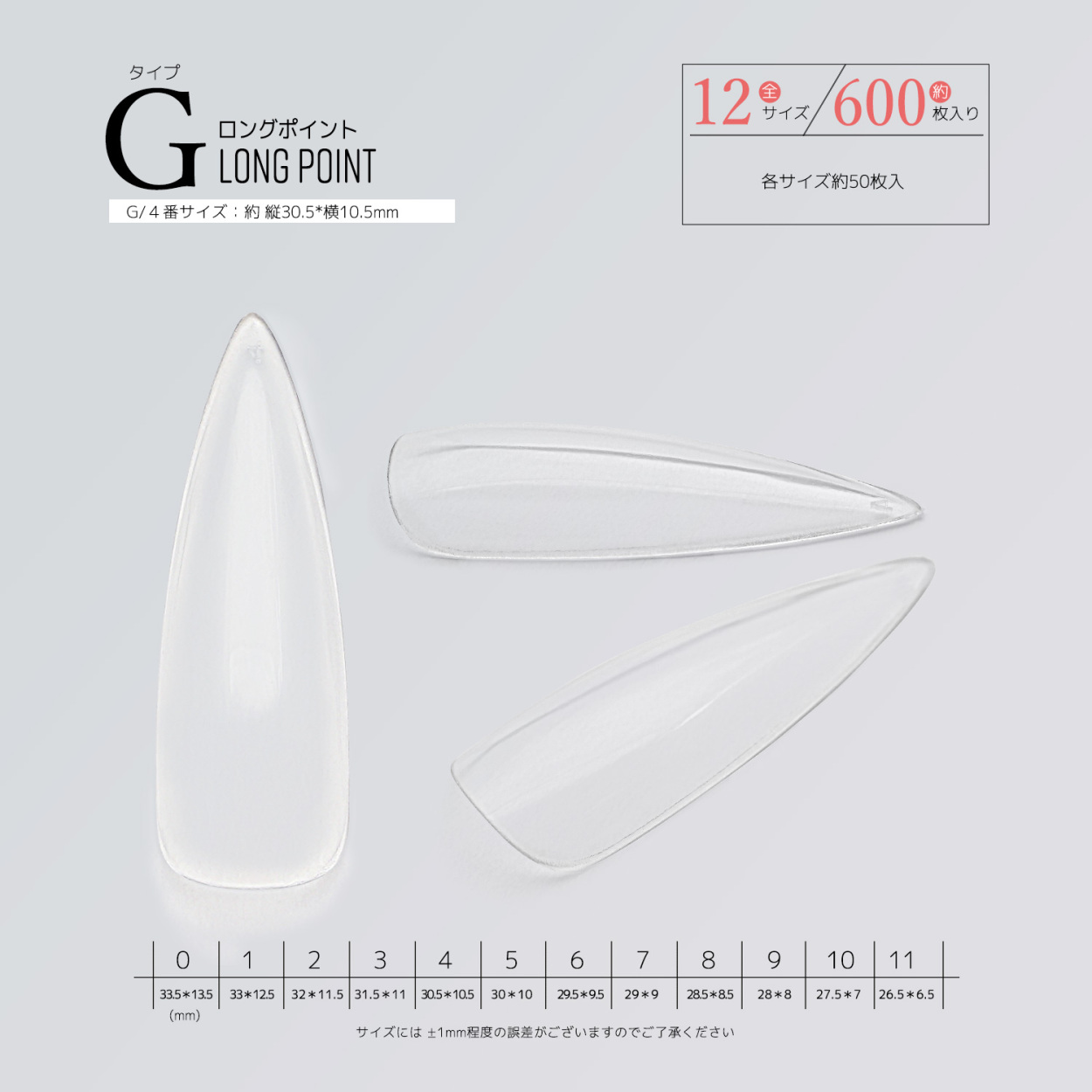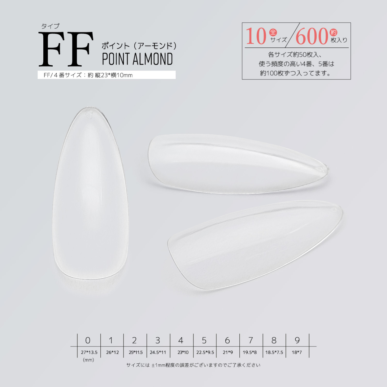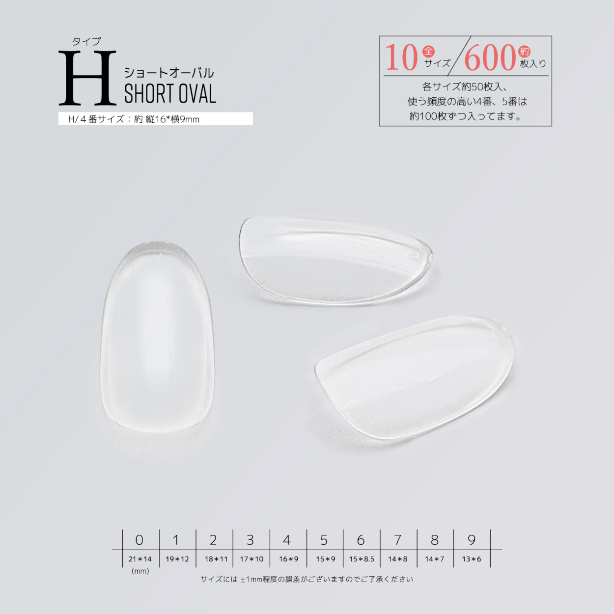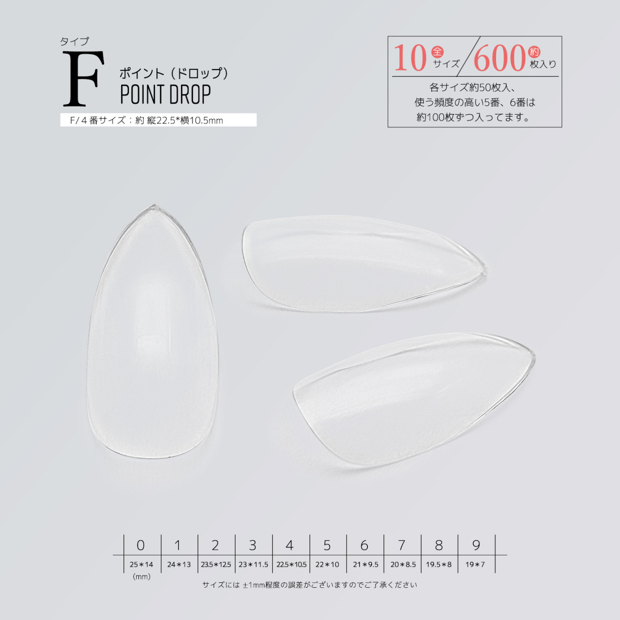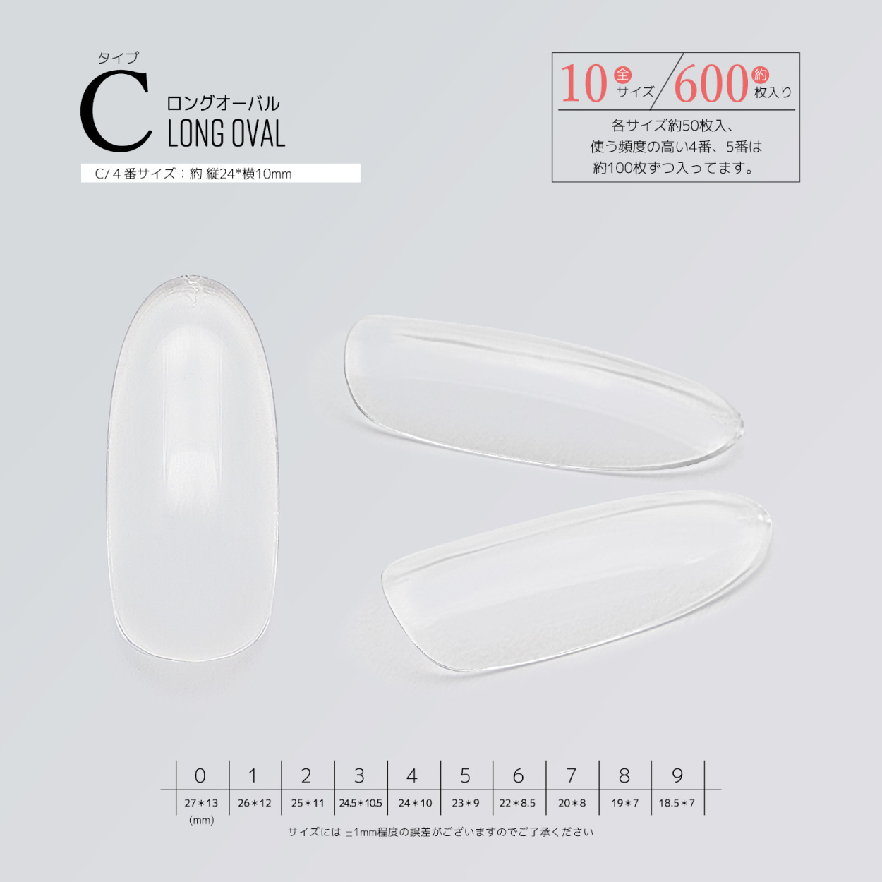 サイズ別単品 チップ サンプル フルチップ クリアチップ ジェルネイル つけ爪 10サイズ 500枚 600枚 練習用 展示チップ ミディアム ロング オーバル ポイント ドロップ アーモンド ショート ベリーショート オーバル フット