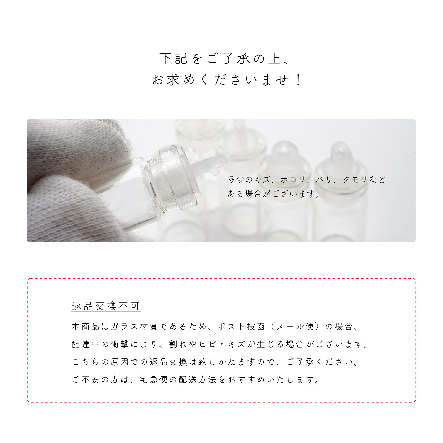 ・本商品はガラス材質であるため、ポスト投函(メール便)の場合、配達中の衝撃により、割れやヒビ・キズが生じる場合がございます。