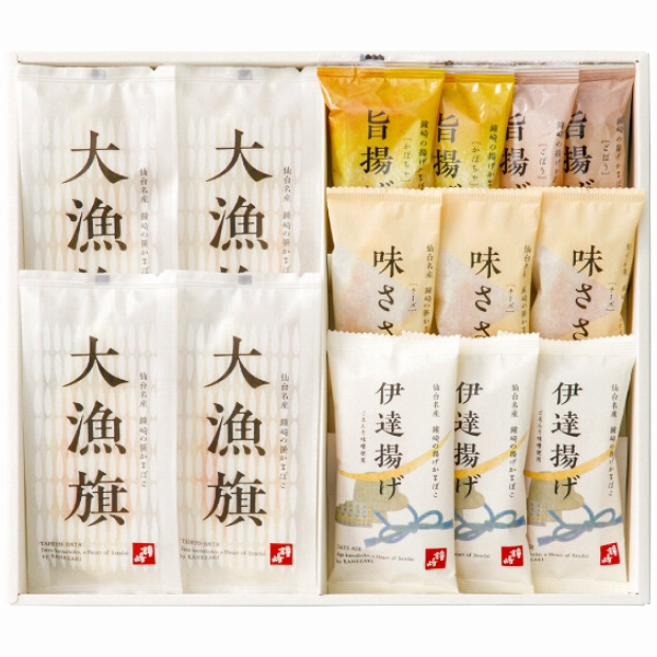 素材にこだわり、保存料、でんぷん、卵白を使用せず、魚のすり身と独自の天然調味料、吉次魚醤など自然の素材だけで作り上げた鐘崎の看板商品「大漁旗」をメインに、かまぼこと相性のいいチーズを練り込んだ「味ささ」、魚本来のうまみと滑らかな食感をお楽しみいただける揚げかまぼこ「旨揚げ」を詰合せました。