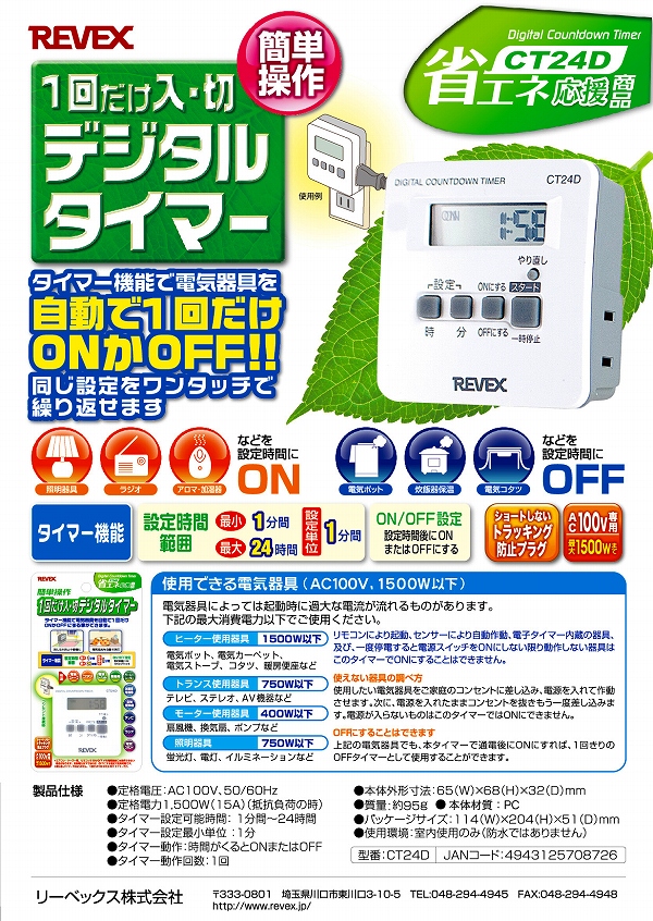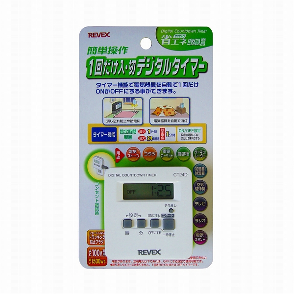 ・電気器具を自動で1回だけONかOFFできます(カウントダウン式/最大24時間・1分単位)。