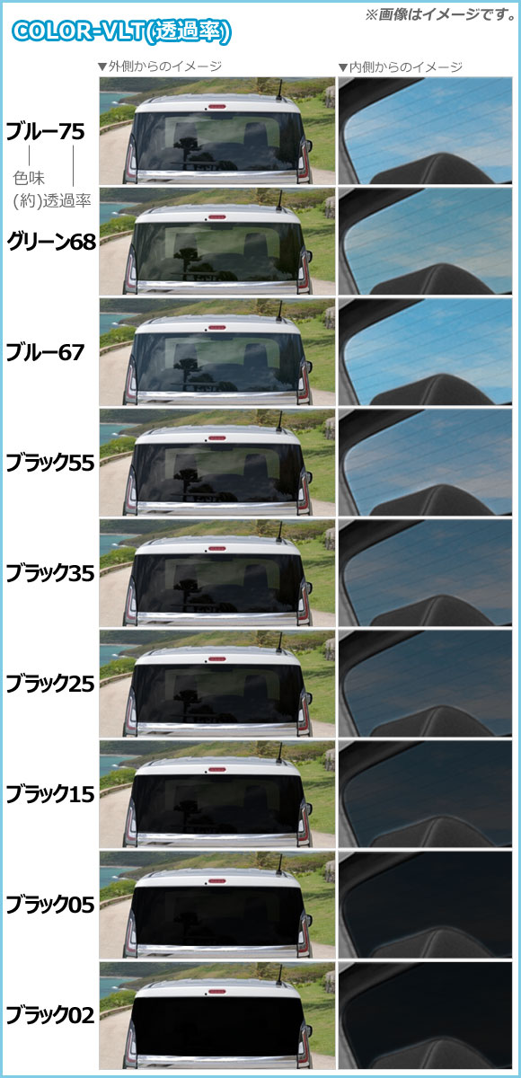 可視光線透過率(VLT)が70%以上で車検対応です。後席はどのフィルムも貼り付け可能です。