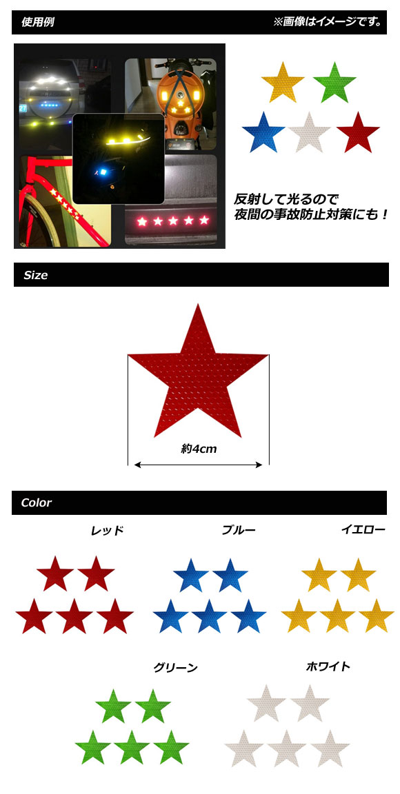 反射ステッカー 反射シール シール ステッカー 蛍光シール 星型ステッカー 5色 バイク 反射 星型 夜間 夜道 蛍光 5枚 光る 散歩 夜 鞄 かばん 自転車 安全対策 安全 三輪車 服 ベビーカー 安全警告 暗い 歩行 歩く サイクリング ウォーキング ジョギング 対策 モーター サイクル オートバイ チャリ スター カラー: ホワイト レッド ブルー イエロー グリーン 白 WHITE 赤 RED 青 BLUE 黄 YELLOW 緑 GREEN AP-UJ0553-WH AP-UJ0553-RD AP-UJ0553-BL AP-UJ0553-YE AP-UJ0553-GR 4580659615009 4580659615016 4580659615023 4580659615030 4580659615047