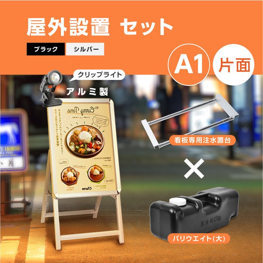 A型スタンド看板 4点セット シルバー(A1サイズスタンド看板、バリウエイト、ウェイトアーム、クリップライト)片面 W640mm×H1225mm 前面開閉式 4set-a1-s
