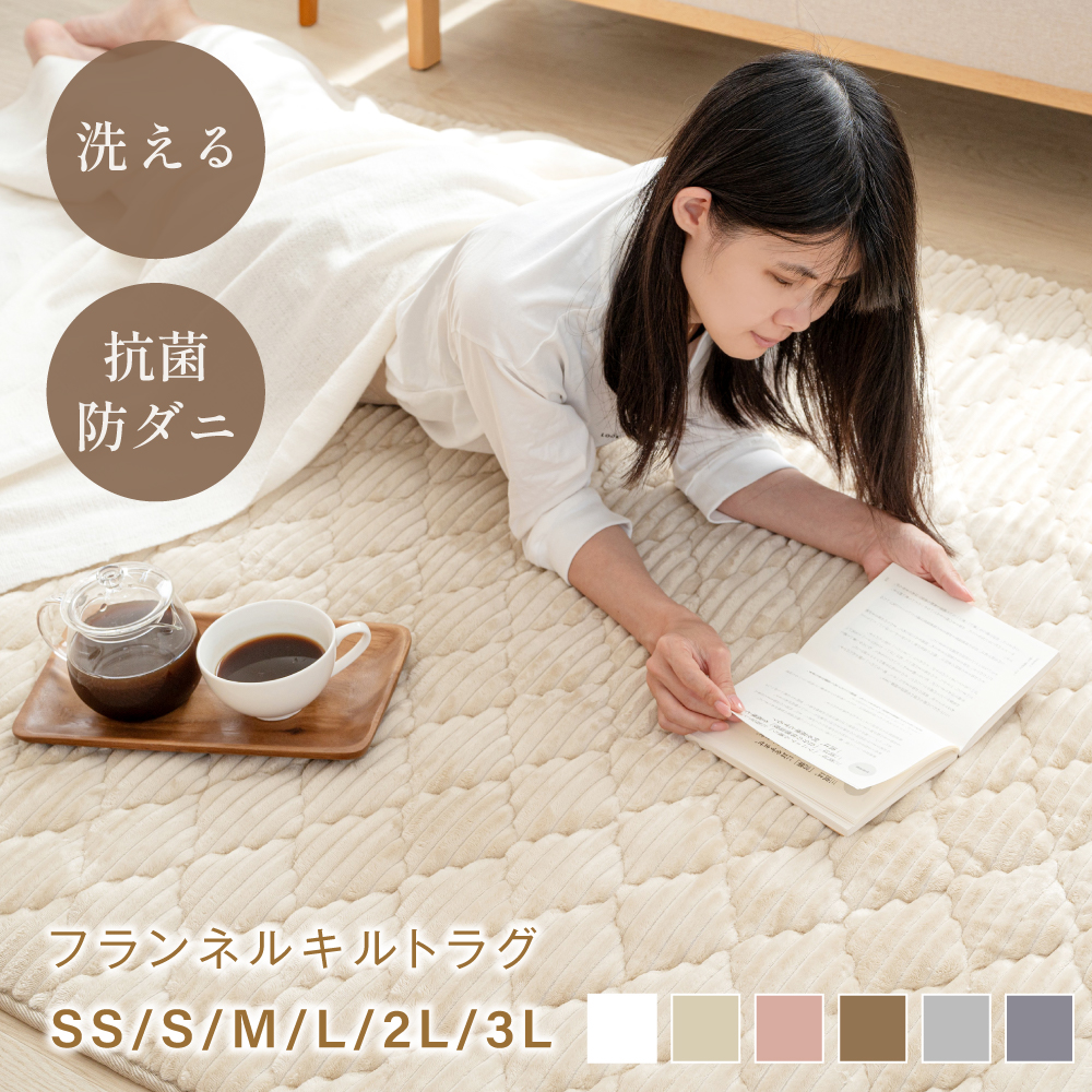 【なめらかなフランネル生地】表生地は肌がすべるなめらかなマイクロファイバーを採用したフランネル起毛です。極細繊維のきめ細やかな毛足は空気を含んでふわふわです。ダイヤ型に縫製されたキルティングの膨らみは、中綿の偏りを防ぎながら装飾としての機能美を備えます。 【二層のクッション構造】ラグの中材はふかふかのマイクロ中綿ともちもちのウレタンの二層のクッションでボリューム感たっぷり!マイクロファイバーの中綿は空気をたっぷり含んでふかふかの感触が魅力。軽くて保温力も抜群です。暖かさを包み込んで逃しません。