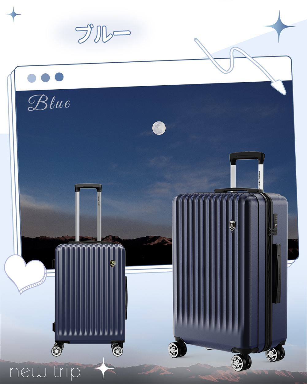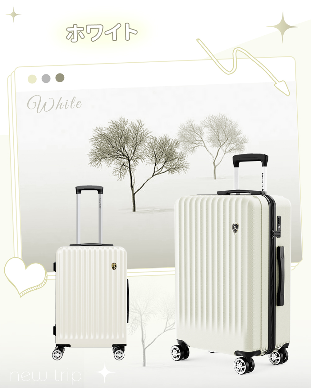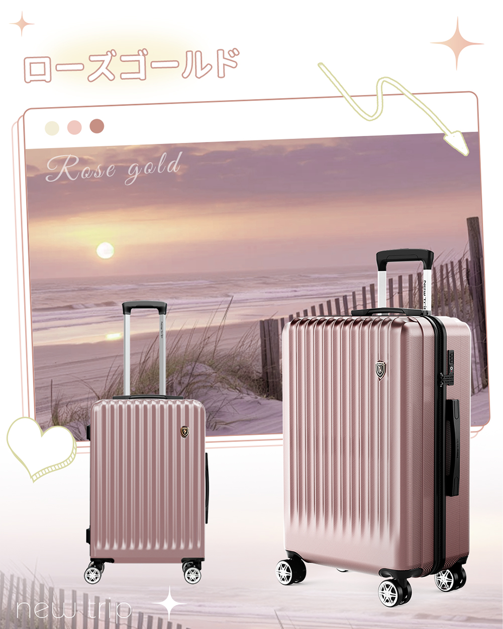 スーツケース キャリーケース 機内持ち込み ストッパー付き キャリーバッグ S M Lサイズ 2泊3日 軽量 静音 かわいい TSAロック New Trip 修学旅行 海外旅行 出張