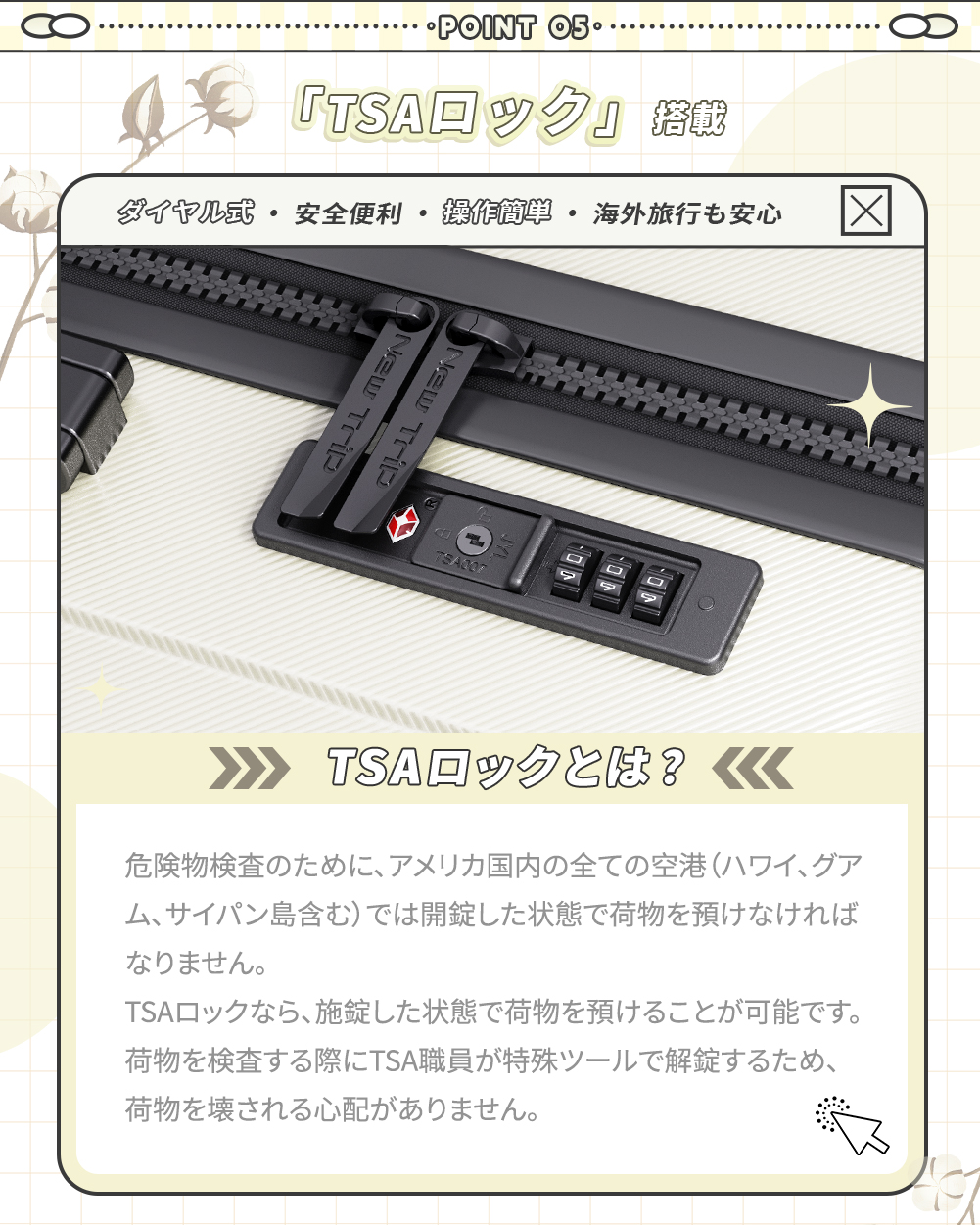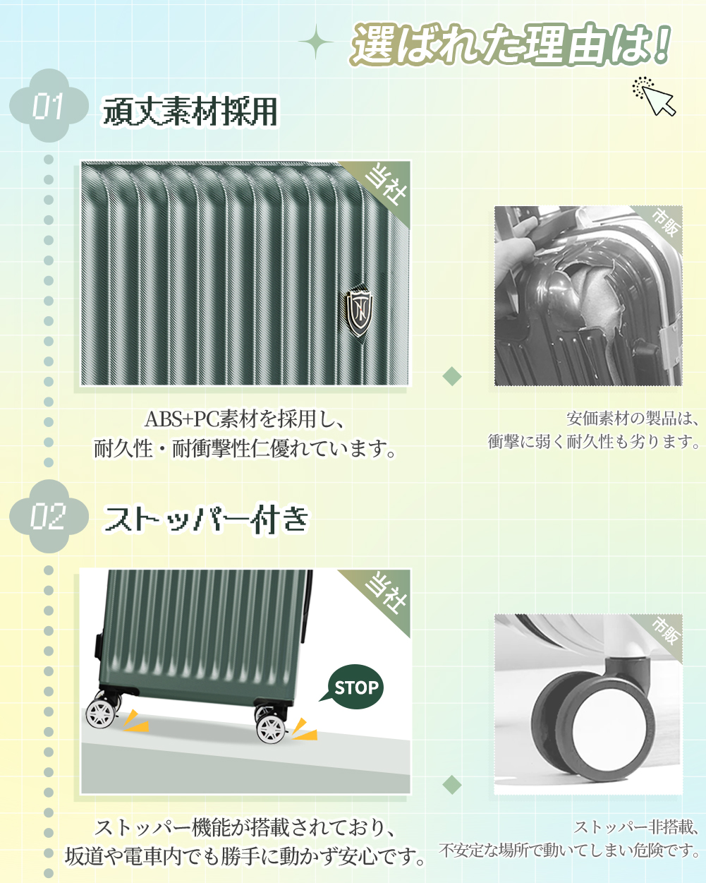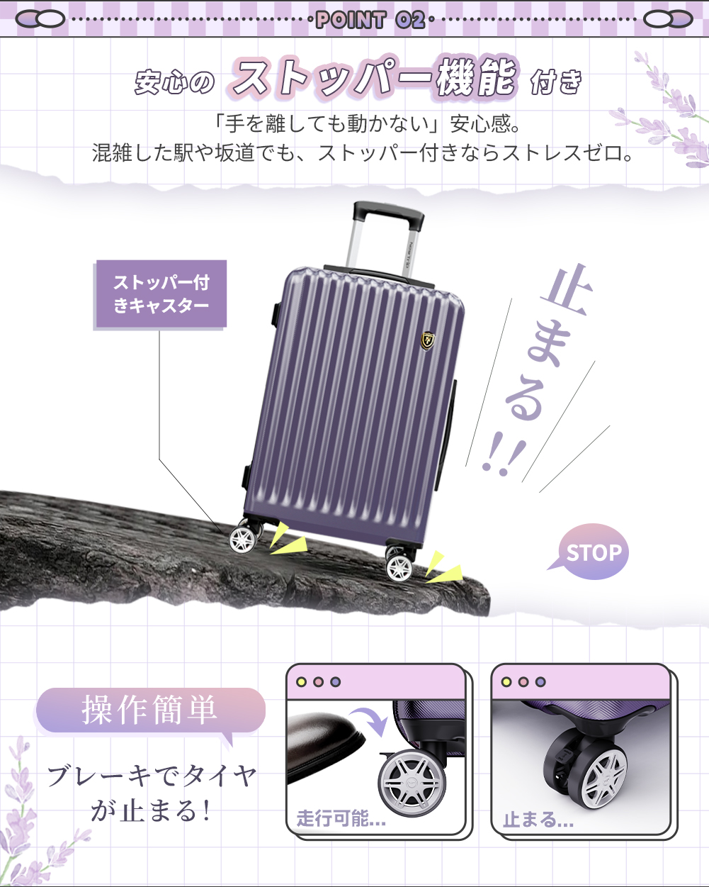 旅行に便利な『TSAロック』、安定走行の『双輪キャスター』も搭載し、ストッパー付もっと快適な旅に