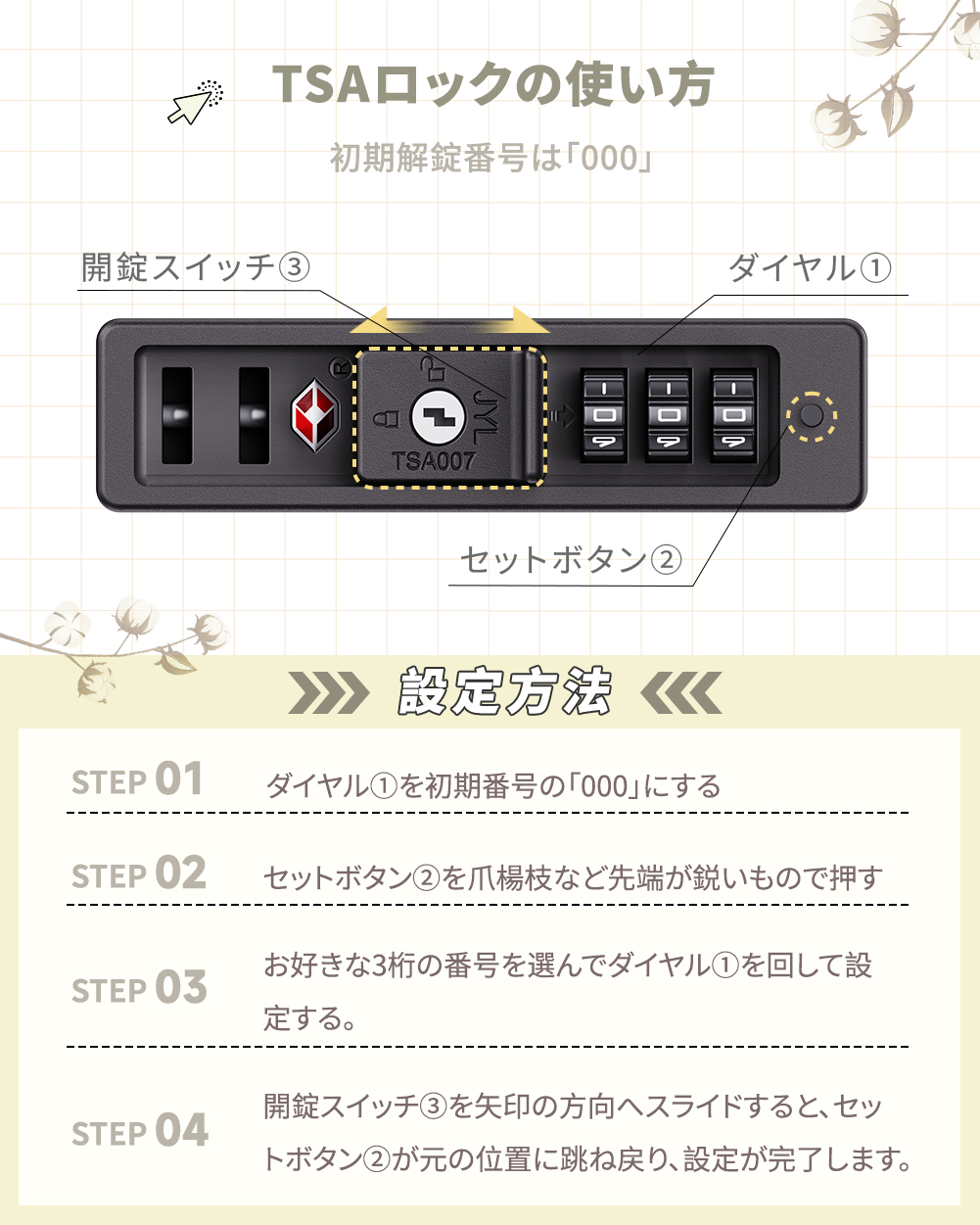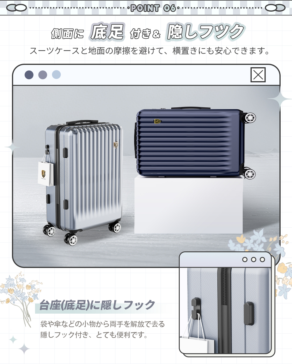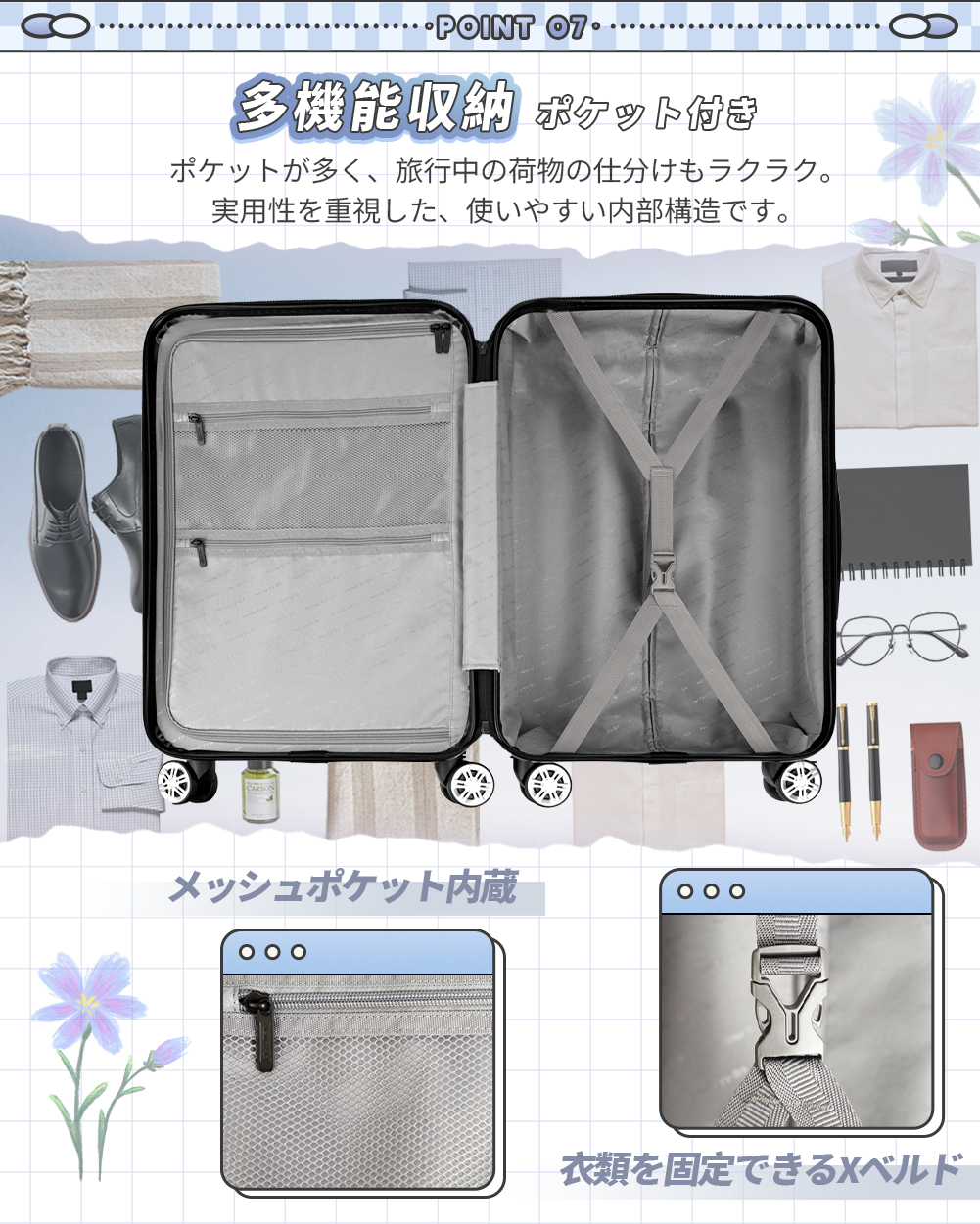 旅行に便利な『TSAロック』、安定走行の『双輪キャスター』も搭載し、ストッパー付もっと快適な旅に
