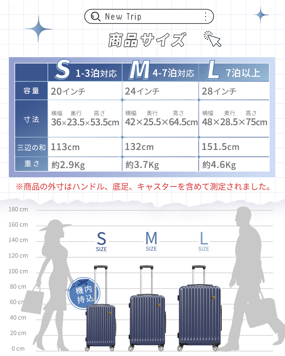 検索キーワード:スーツケース キャリーケース キャリーバッグ Sサイズ Mサイズ Lサイズ 40L/60L/95L 20/24/28インチ 超軽量 YKKファスナー TSAロック ファスナータイプ 耐衝撃 大型 静音 ダブルキャスター 旅行支援企画 旅行 修学旅行 海外旅行 国内旅行 GOTOトラベル ビジネス 出張 1泊 3泊 静音 360度回転 格安 大容量 傷が目たちにくい 安心 送料無料 即納 海外 国内 旅行 おすすめ かわいい 女子旅 全国旅行支援 大容量 NEW TRIP正規代理