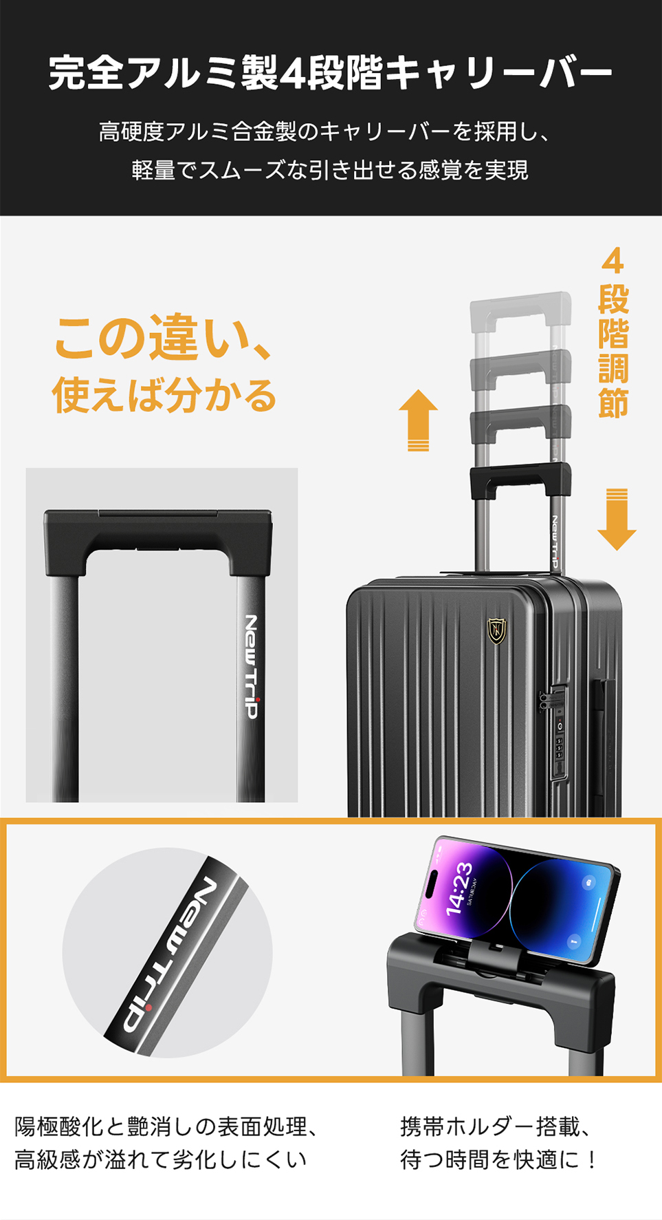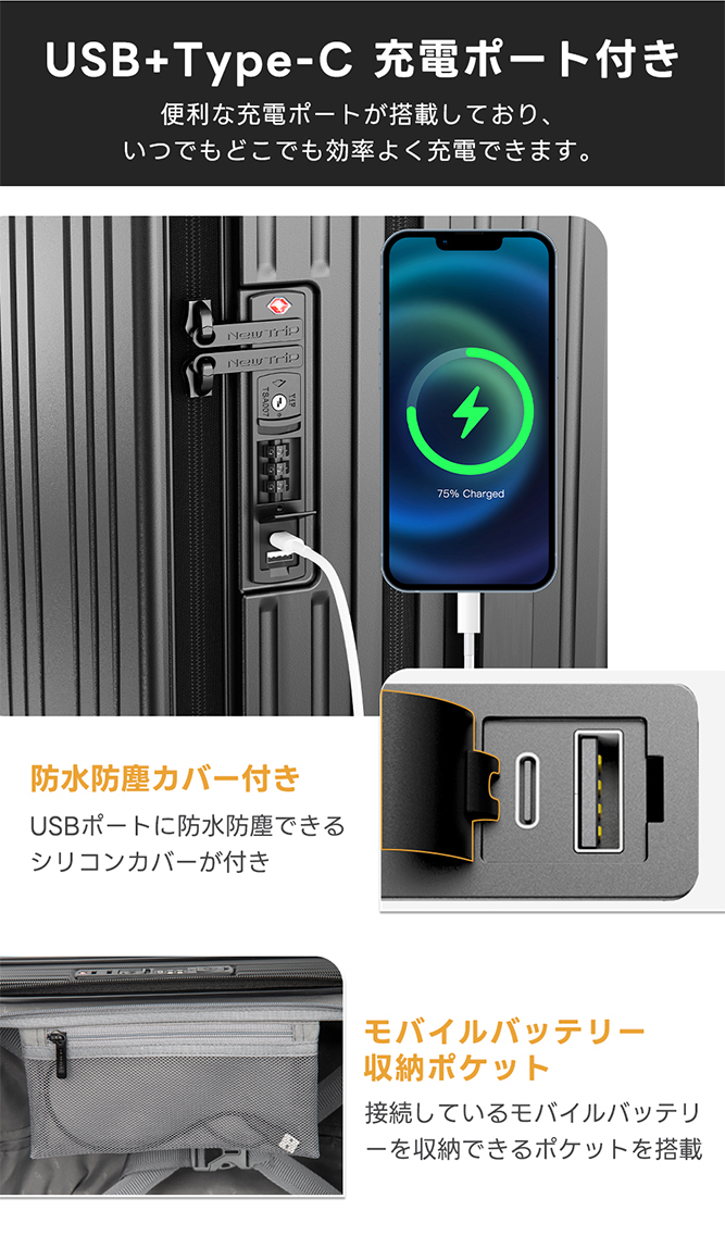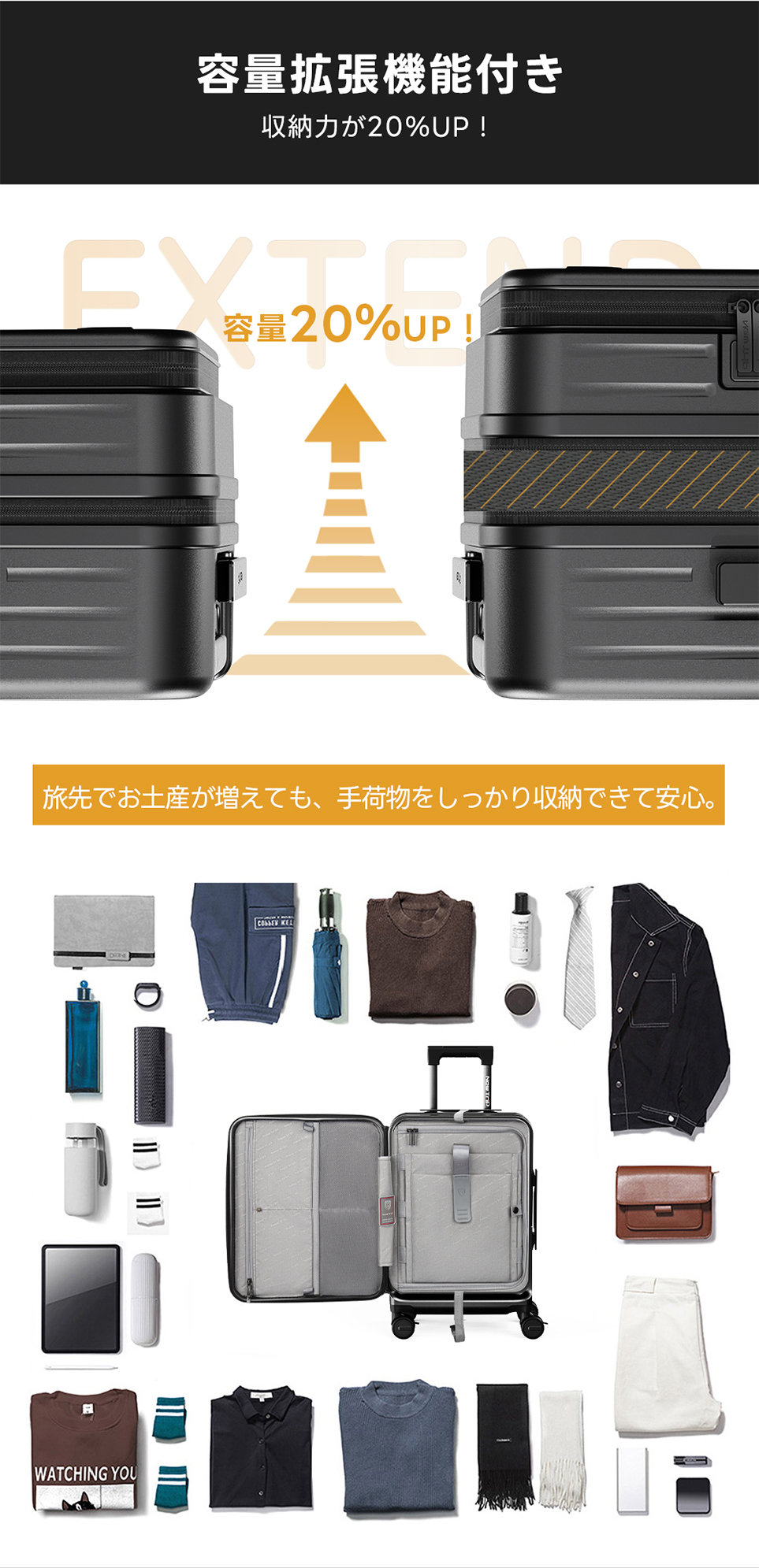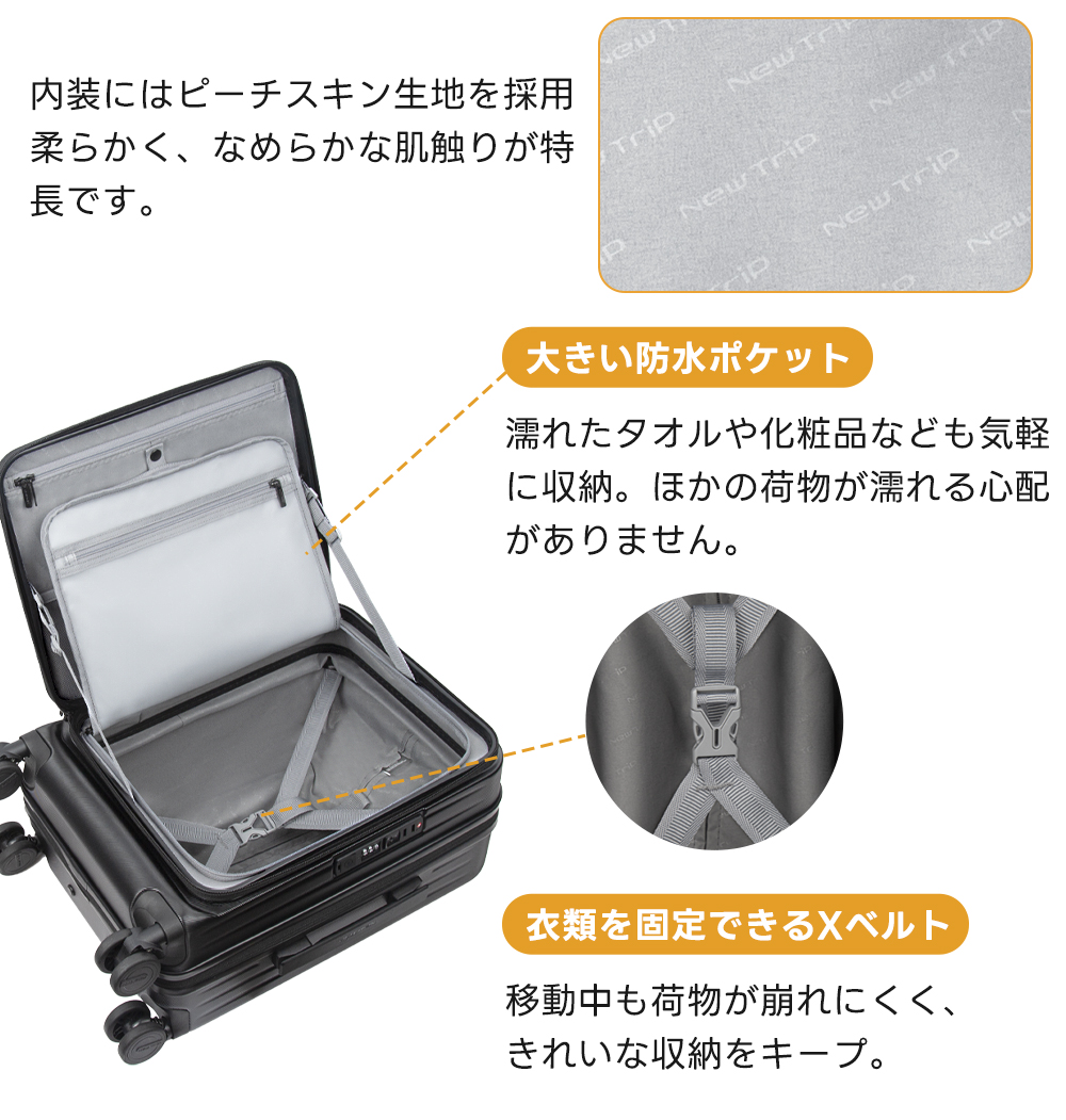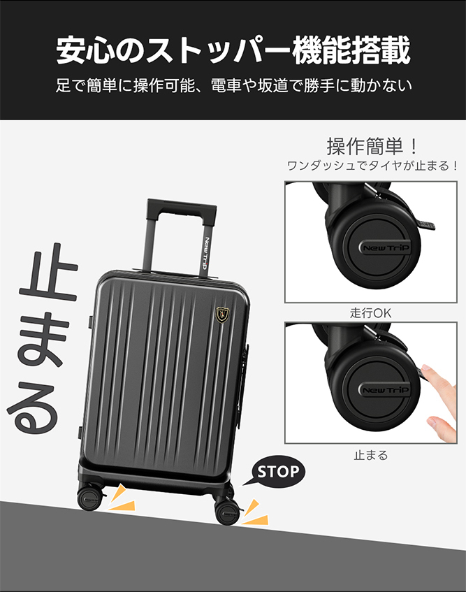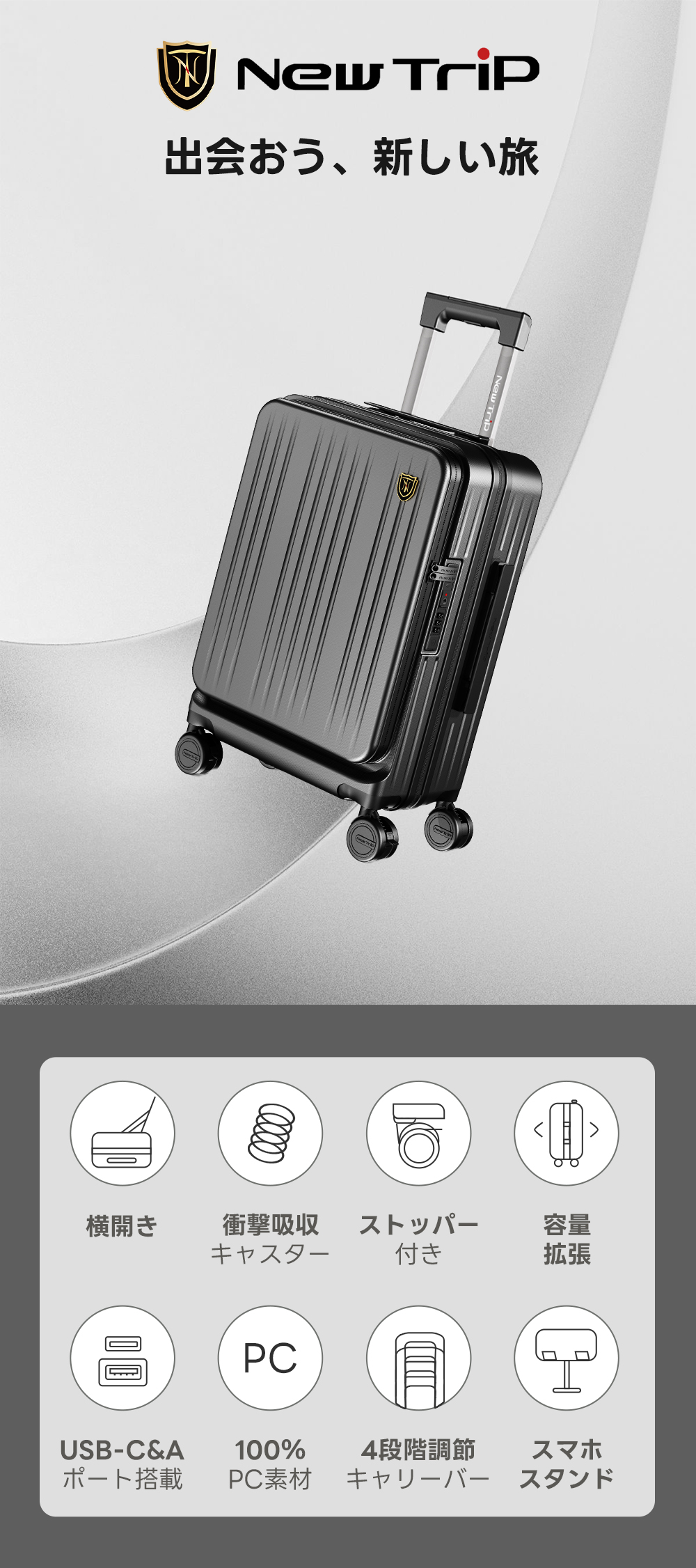 スーツケース 機内持ち込み フロントオープン 拡張機能付き 横開き ストッパー付き 軽量 大容量 Sサイズ キャリーケース キャリーバッグ 充電 New Trip 海外旅行