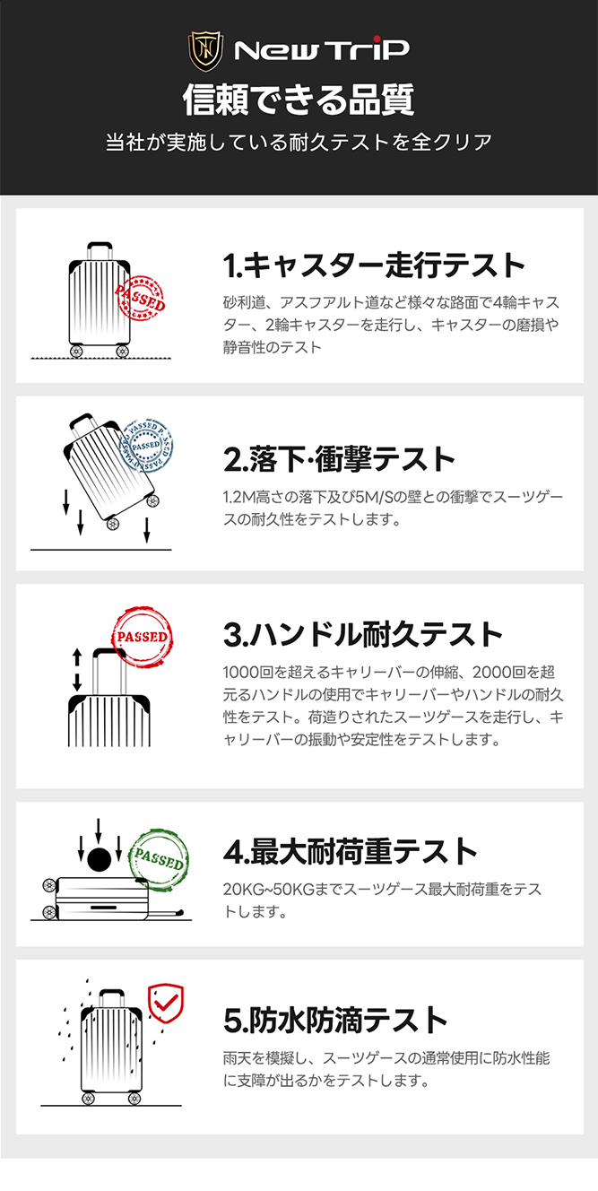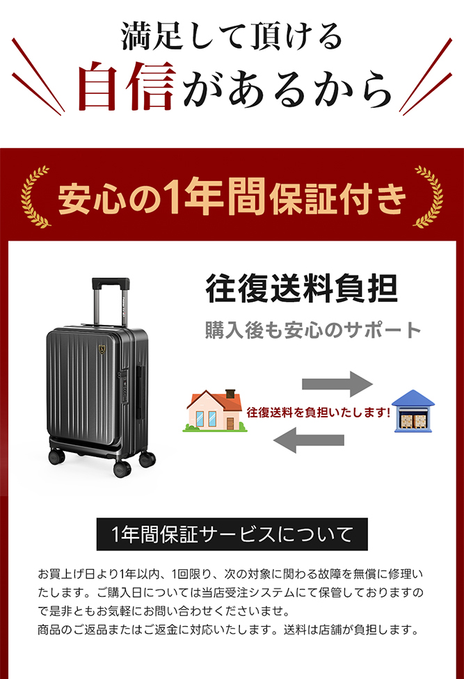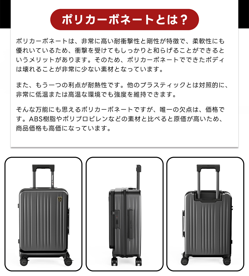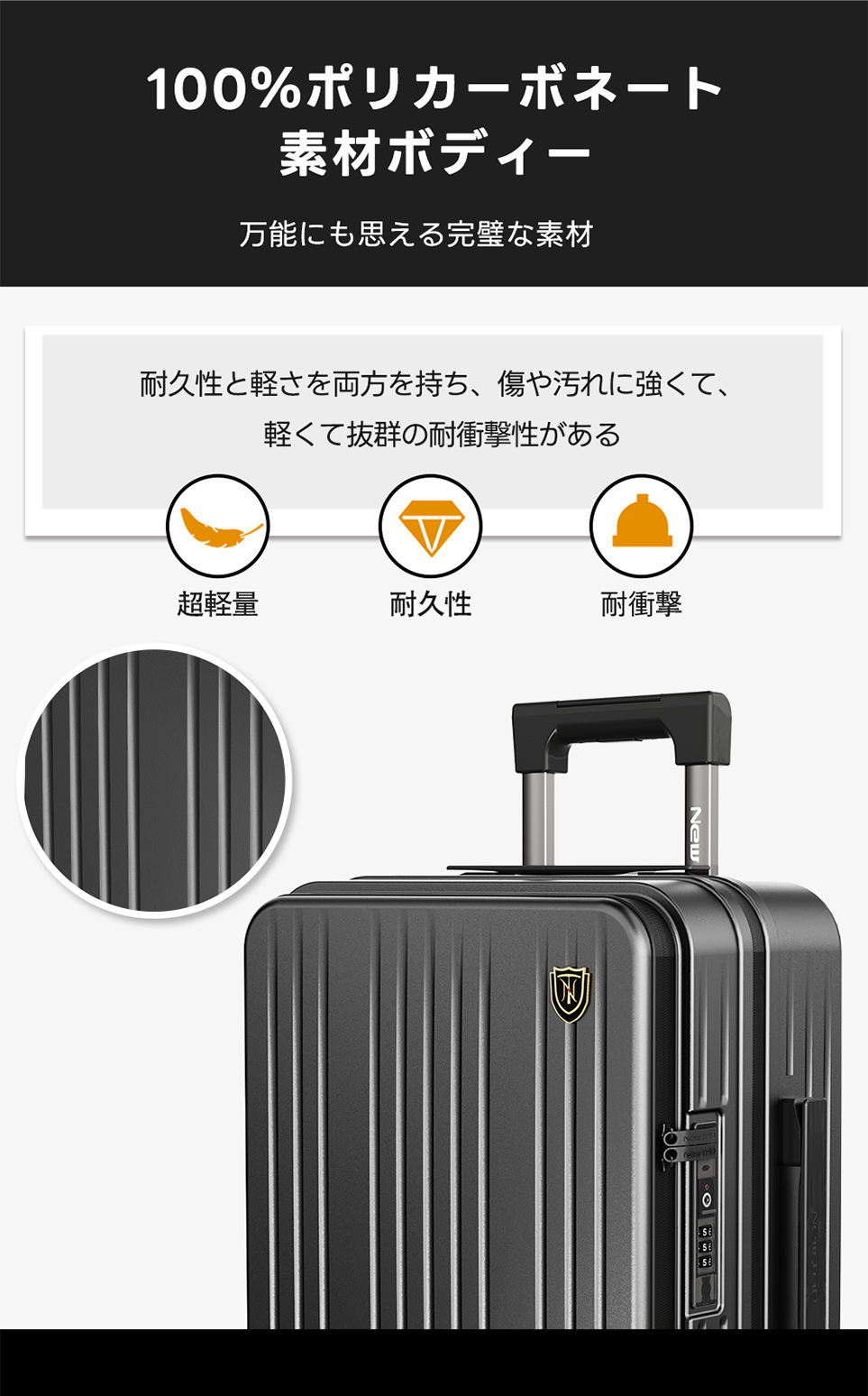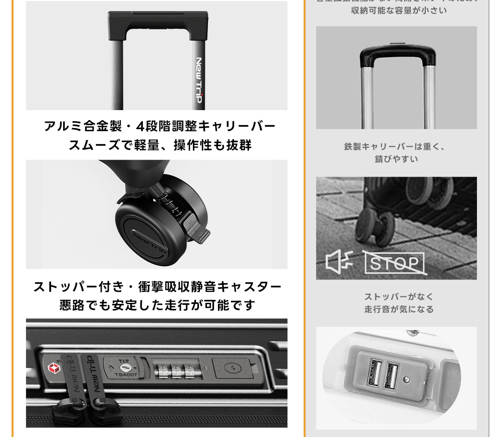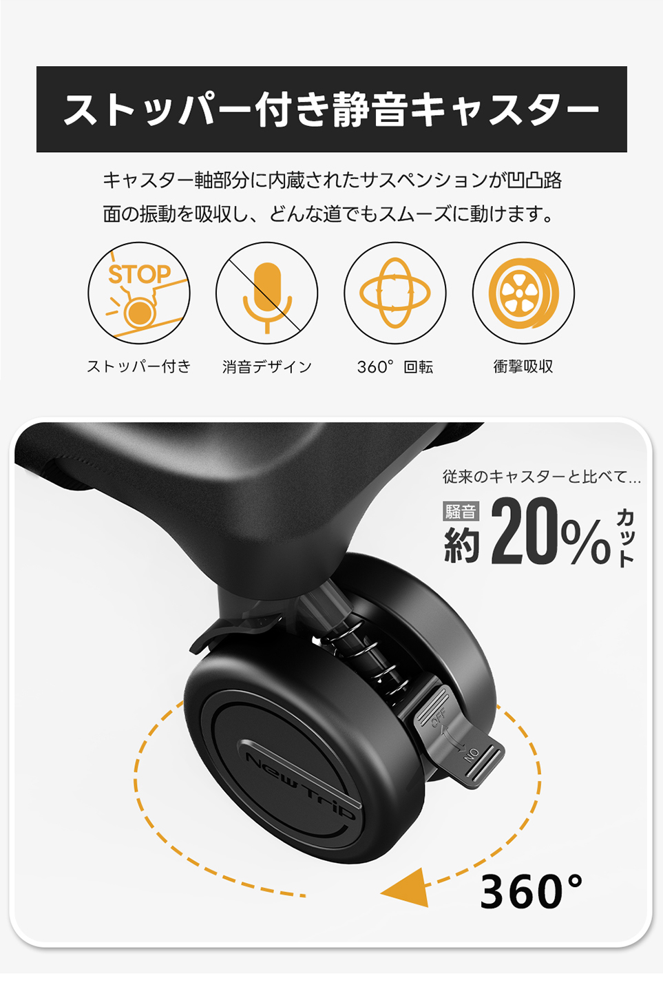 旅行に便利な『TSAロック』、安定走行の『双輪キャスター』も搭載し、ストッパー付きもっと快適な旅に