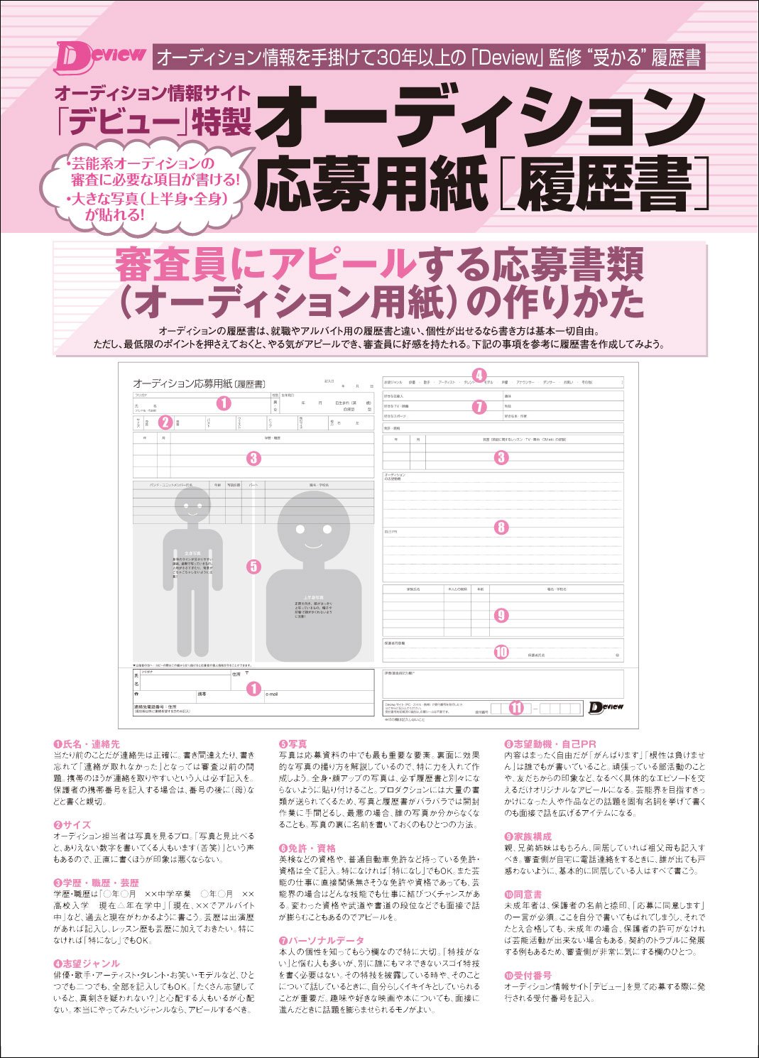 1983年にスタートして以来、「安心して応募できる芸能オーディション情報」を提供し続けてきた 「DeView」のノウハウをベースに作り上げたオリジナルオーディション応募用紙です。 芸能系オーディションの審査に必要なデータやアピール項目を記入できるうえ、 サービス判の写真を貼付できる大きな写真スペースが設けられており、 芸能プロダクションやオーディション、コンテストの主催者からも好評を得ています。 あなたはまだ、オーディション応募に就職やアルバイト用の履歴書を使っていませんか? 審査員への印象度がアップするオーディション応募用紙でチャンスをつかみましょう。