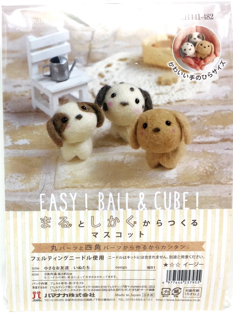 丸パーツと四角パーツから作るからカンタン サイズ:3体共通高さ約5cm ニードルの刺し具合によって大きさはかわってきます。 パック内容:フェルト羊毛、目、テキスト 用意するもの:フェルティング用ニードルレギュラー(H441-014)、フェルティング用マット(H441-015)又はフェルティングニードルスターターセット (H441-035) はさみ、目打ち、ボンド、まち針、チーク、綿棒 (.co.jpより)