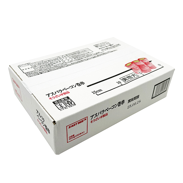 ベーコン(豚肉、食塩、複合たん白(乳成分・卵・大豆・豚肉を含む)、砂糖、還元澱粉糖化物、小麦粉)、アスパラガス(中国産)/ソルビトール、リン酸塩(Na)、セルロース、増粘多糖類、調味料(アミノ酸)、酸化防止剤(V.C)、発色剤(亜硝酸Na)、コチニール色素、香辛料抽出物