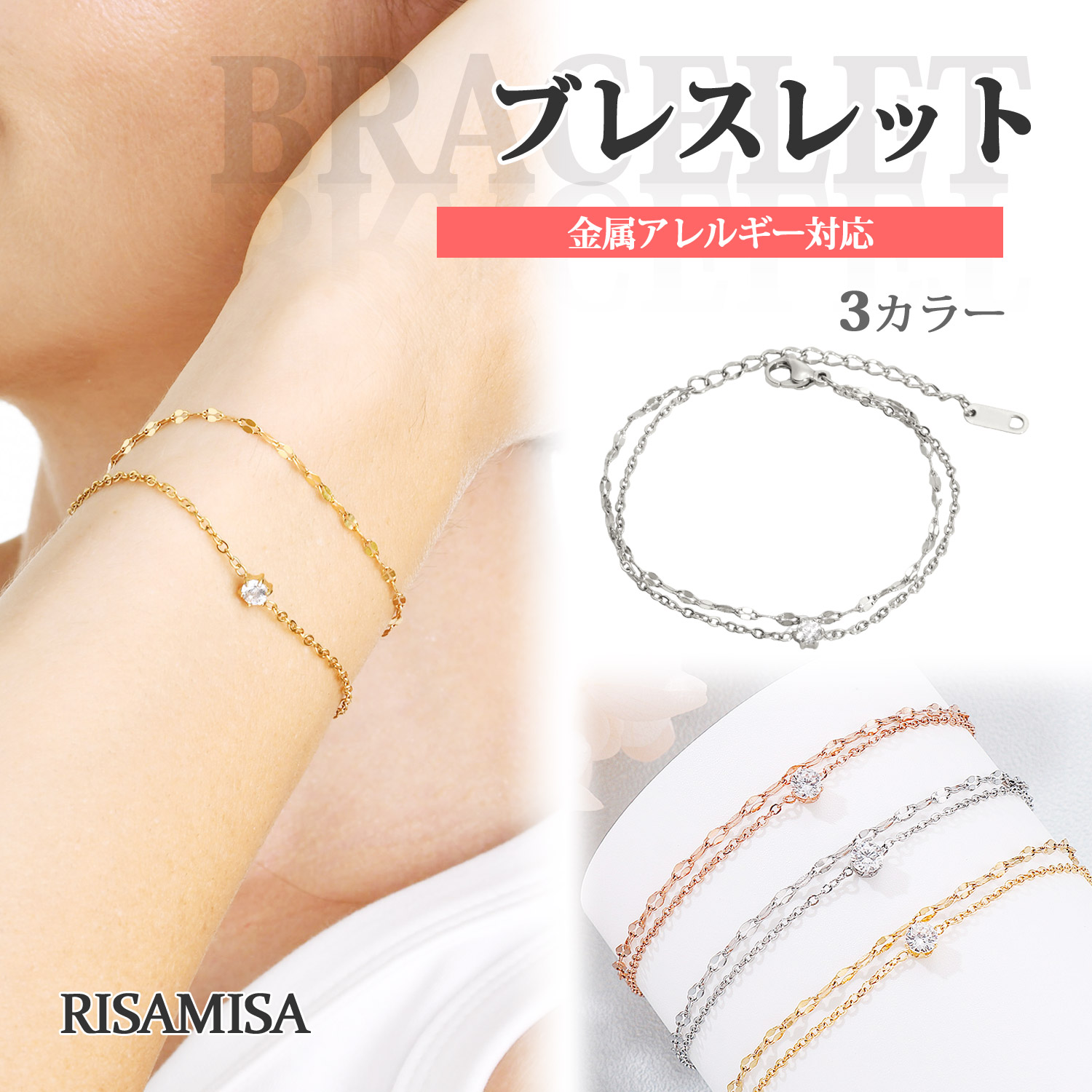 ブレスレット チェーン 金属アレルギー対応 サージカルステンレス 2連 一粒ジュエル ストーン エクレア ペタル レディース 華奢 大人