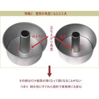 アルミ製で熱伝導がよく、熱ムラがなくきれいに仕上がります。<br> つなぎ目のないシフォンケーキ型10cmの特長<br> <br> ■1枚絞り(溶接でなく、1枚の板を元型に合わせて押し曲げて作る方法)のため、煙突部分につなぎ目がなく離型もお手入れも簡単!<br> <br> ■煙突部分の根元を鋭角に折り曲げず、見た目にわからない程度になめらかに絞るため、その部分だけ板厚が薄くなって弱くなることがありません。<br> <br> ■裏面がフチ折りしてあり、洗浄時などに怪我をする心配がなく、本体の強度もUP! <br> <br> ■取扱方法・その他注意事項<br> 空焼きの必要はありません。<br> ご使用後は、洗ってよく乾燥させて保管してください。<br> こびりついた汚れは、しばらく水につけてふやかし、ス