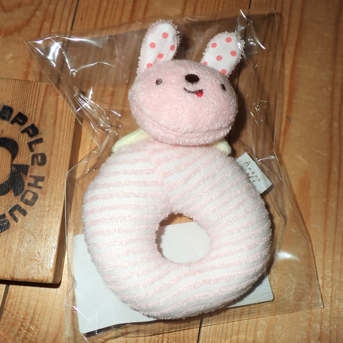 肌触りの優しいパイル素材になっています。振るとリンリンと優しい音色がします。赤ちゃんの枕元に置き、リング部分にねんねした赤ちゃんのおしゃぶり置きにしてもかわいいです。