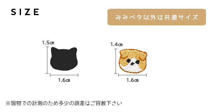 | サイズ | (縦/横の順) 共通サイズ(1.5cm/1.6cm) みみペタ(1.4cm/1.6cm) ※現物での計測となりますので多少の誤差はご了承ください |