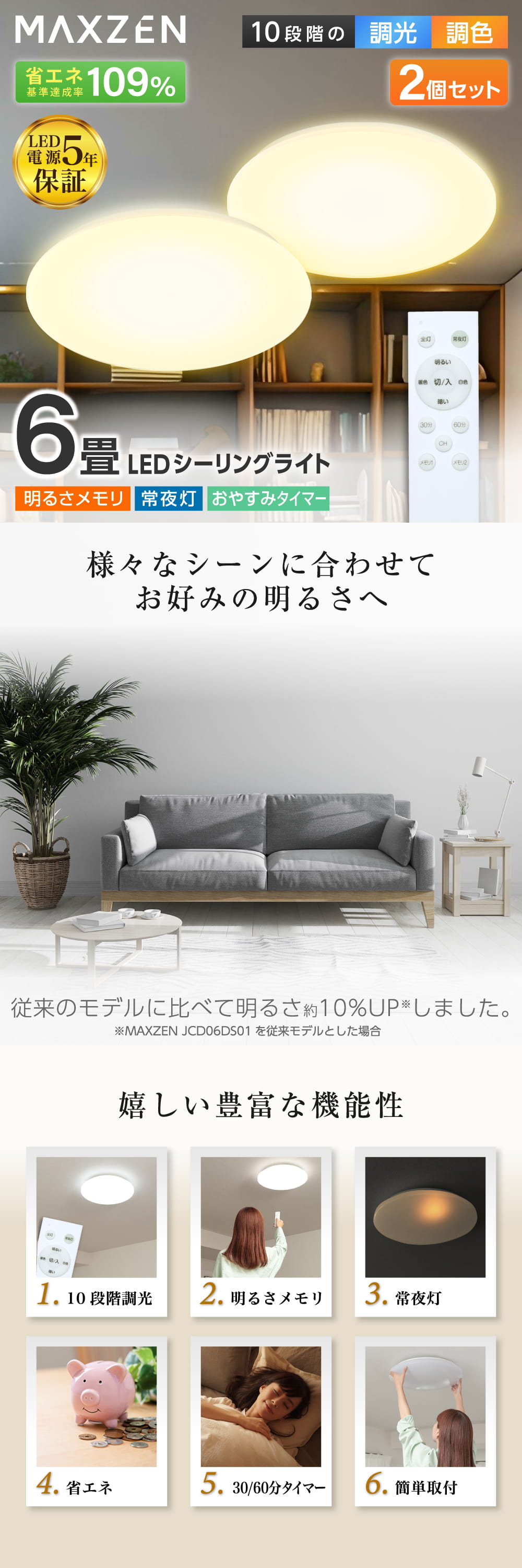 シーリングライト LED 6畳 MAXZEN 天井照明 2個セット 調光 調色 電球色 昼光色 常夜灯 照明 長寿命 メモリ機能 MCM06LT01 一人暮らし 新生活 マクスゼン