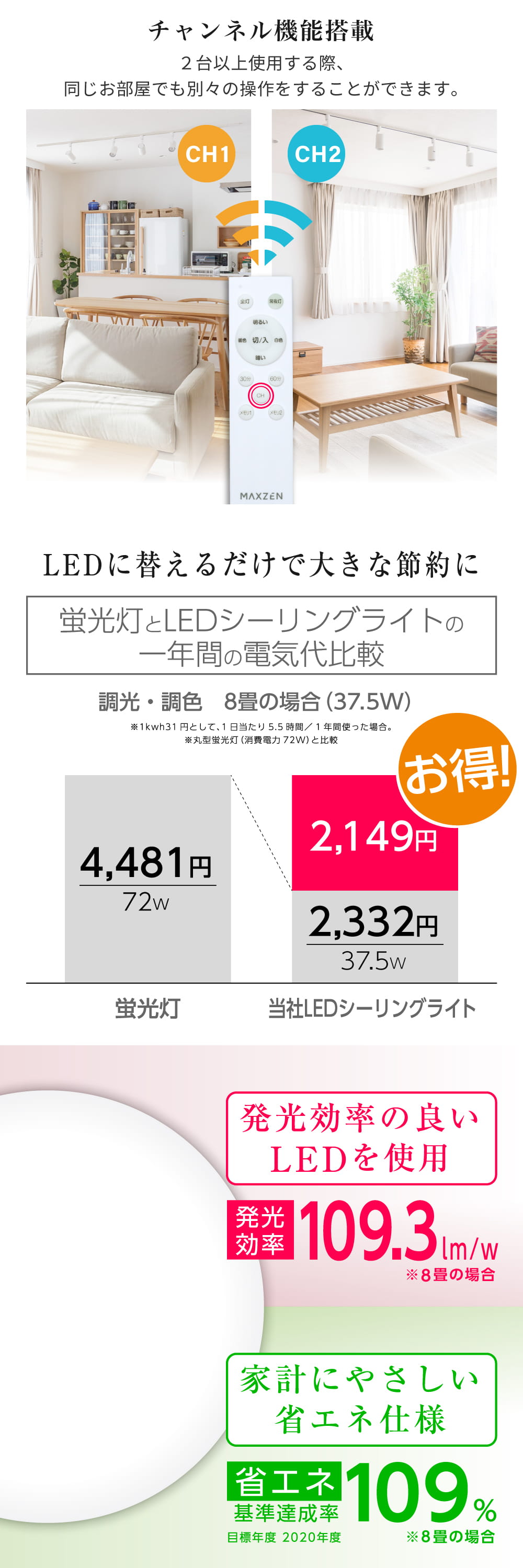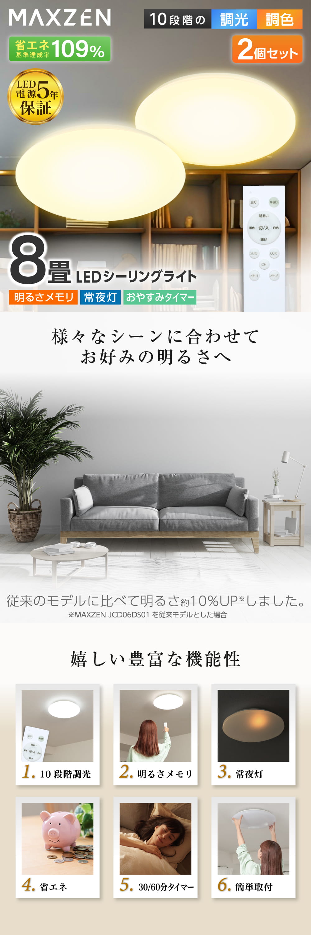 シーリングライト LED 8畳 MAXZEN 天井照明 2個セット 調光 調色 電球色 昼光色 常夜灯 照明 長寿命 メモリ機能 MCM08LT01 一人暮らし 新生活 マクスゼン