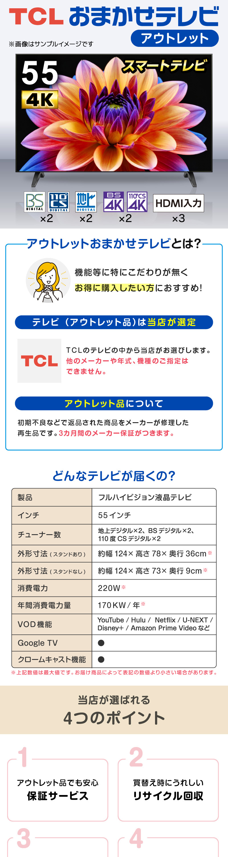 おまかせ TCL 55V型 4Kスマートテレビ 再生品