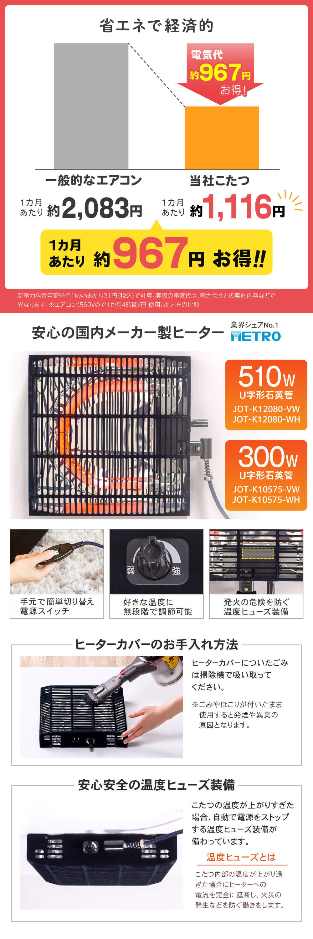 ・安全装置:本体:温度ヒューズ / 電源コード:電流ヒューズ