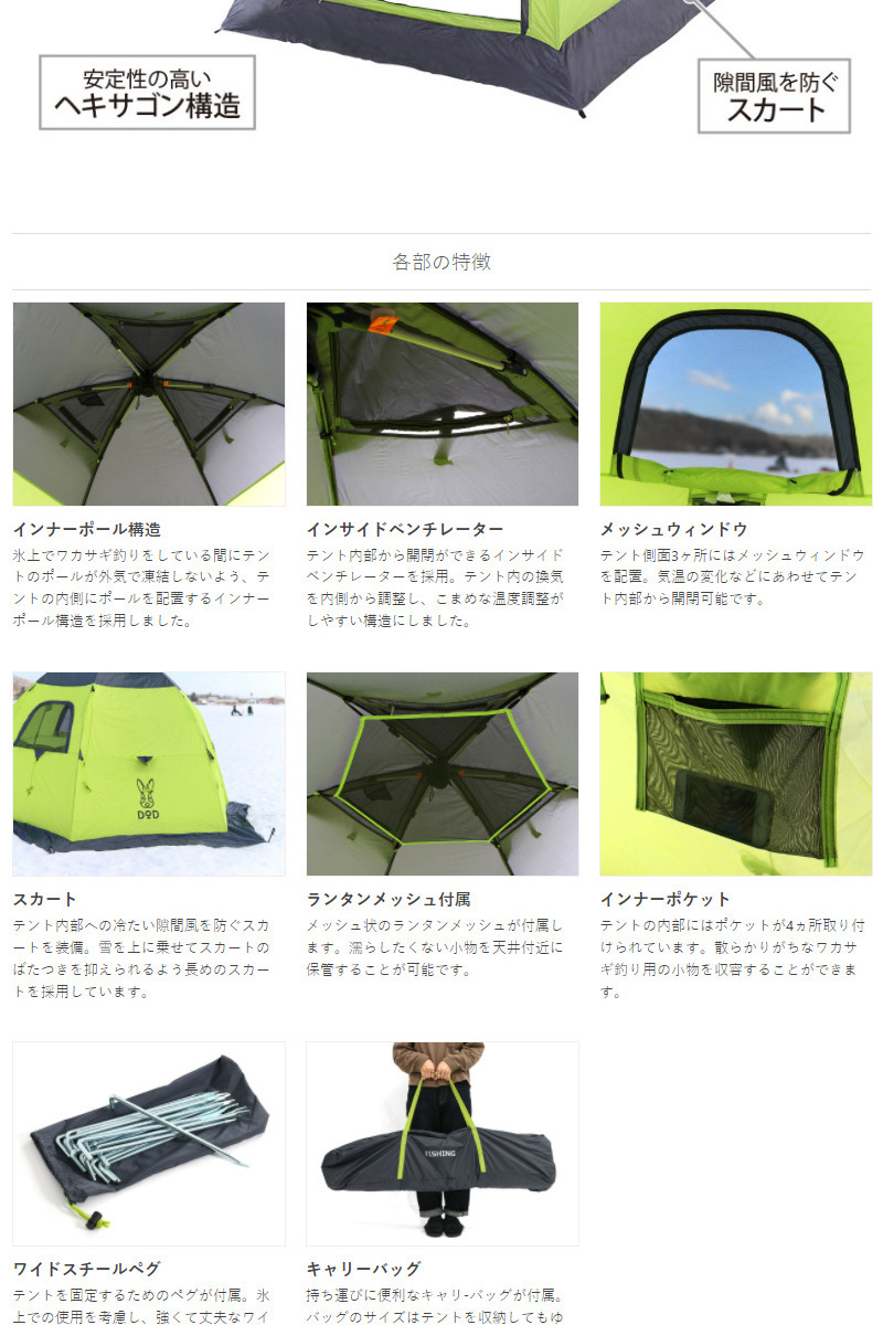 氷上でワカサギ釣りをしている間にテントのポールが外気で凍結しないよう、テントの内側にポールを配置するインナーポール構造を採用しました。