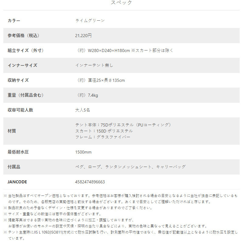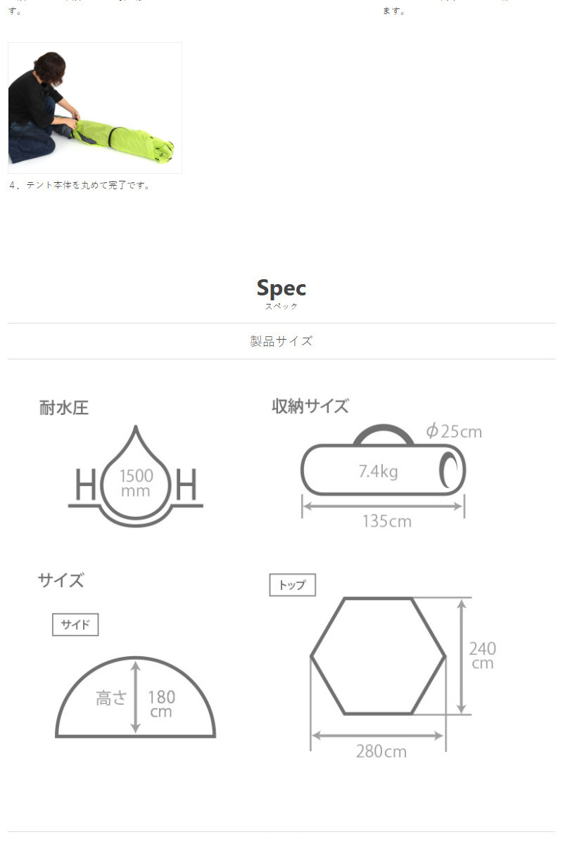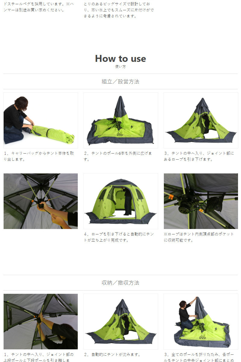 本製品はテント一面あたりの面積が小さいヘキサゴン形状を採用。テントが飛びにくい形状です。また6本足でテントを支えることで4本足のテントと比べ高い安定性を確保しています。