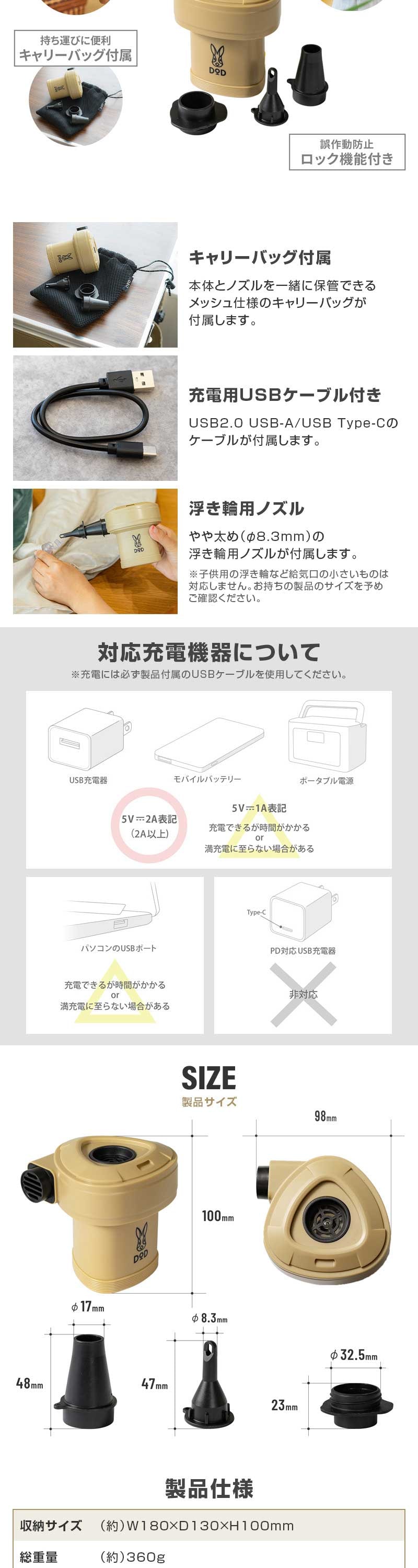 ※子供用の浮き輪など給気口の小さいものは対応しません。お持ちの製品のサイズを予めご確認ください。