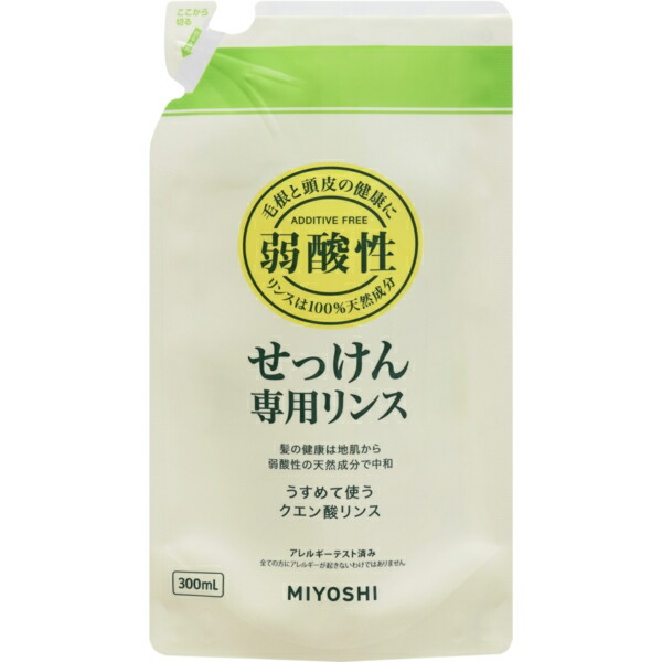★ 弱アルカリ性のせっけんシャンプー後の髪を中和する弱酸性リンス。香料・着色料・防腐剤などの合成化学成分は一切不使用。天然成分のクエン酸で、髪のきしみを和らげます。301倍に薄めて使うタイプだから、とても経済的です。* 商品サイズ: 120×220×60* 全成分: 水.クエン酸、クエン酸Na