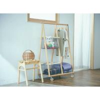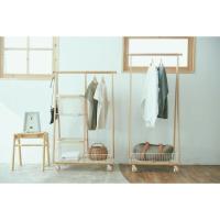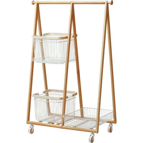コンパクトサイズのバスケット付きハンガーラック。取っ手付きの収納カゴは持ち運び可能です。
