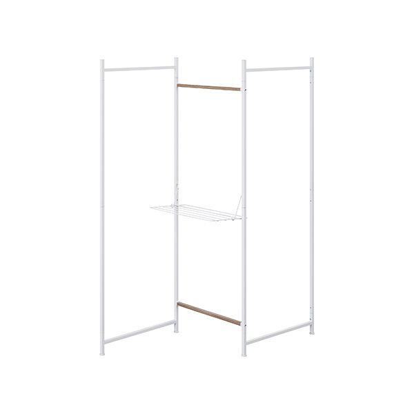 落ち着いたマットな質感と木目調のアクセントで、まるで家具のような佇まいに。表面はパウダーコーティングで、キズ・サビにも強い。インテリアに馴染みやすく、ハンガーラックとしても併用いただけます。