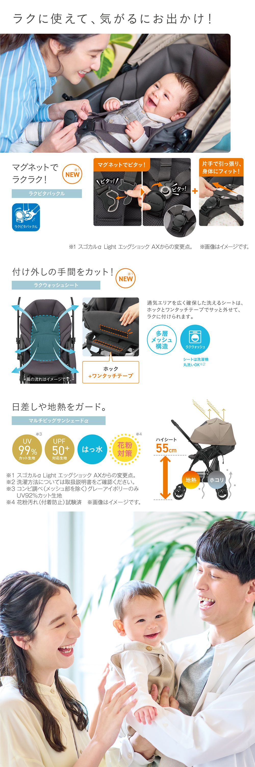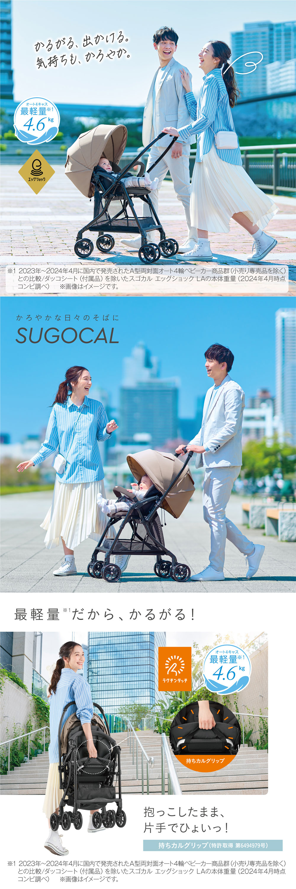 ★ オート4キャス最軽量4.6kg(※A型両対面オート4輪ベビーカー/2023年〜2024年4月国内発売品/小売り専売品を除く商品群との比較/ダッコシート(付属品)は除く/2024年4月時点 メーカー調べ)