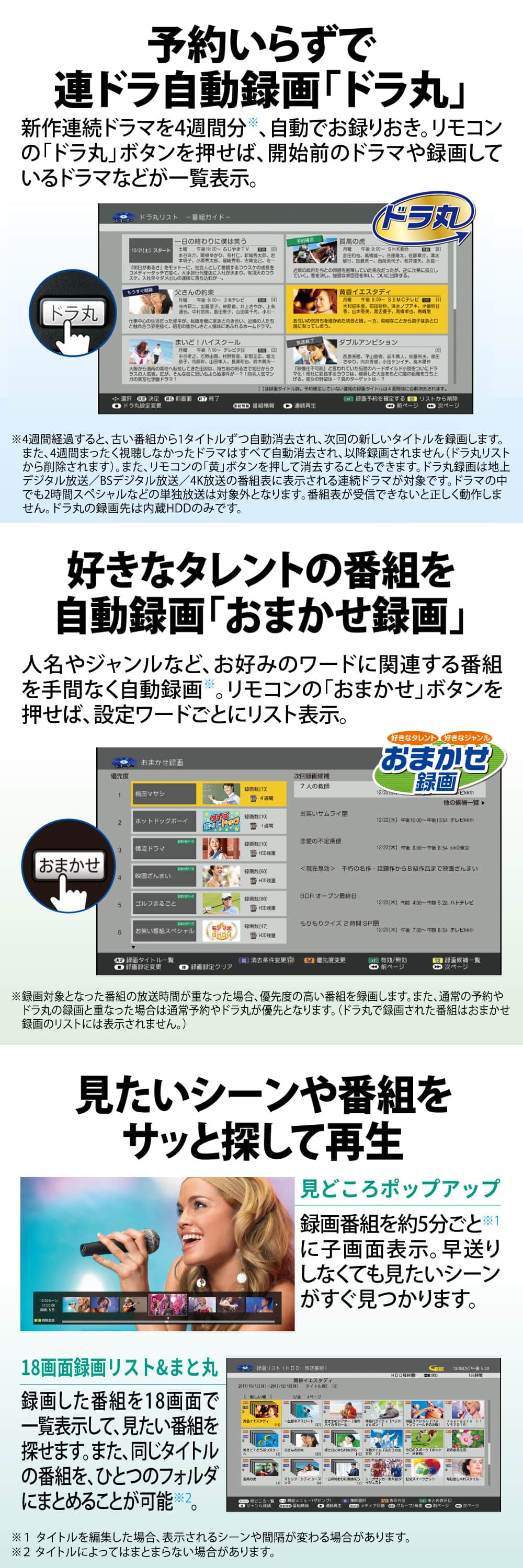 「見どころポップアップ」「18画面録画リスト」など、たくさん録画してもテキパキ再生できる便利な機能が充実しています。