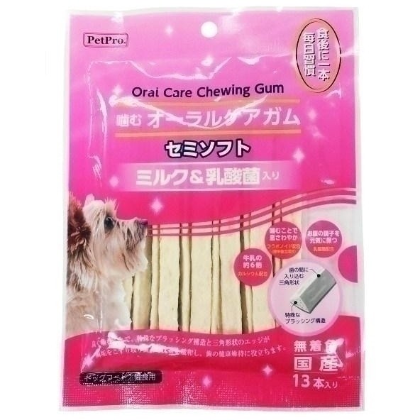 ・炭酸カルシウムの1つ1つの粒で、噛むことで汚れスッキリ!・カルシム配合!(牛乳の約6倍)・フラボノイド(緑茶抽出成分)配合で息さわやか!・食物繊維配合でお腹スッキリ!・ビタミンE配合でお口を健康に保ちます!・乳酸菌配合(腸まで届く乳酸菌使用)でお腹の調子を元気に保ちます!【スペック】【分類】ガム【原材料】牛皮、米粉、大豆たん白、食物繊維、乳酸菌発酵物、増粘安定剤(加工澱粉・増粘多頭類)、グリセリン、ソルビトール、炭酸カルシウム、カゼインNa(原材料の一部に乳を含む)、亜硫酸水素Na、ビタミンE、フラボノイド、PH調整剤、乳化剤、ミルクフレーバー【保証成分】粗たんぱく質・・・55.0%以上、粗脂肪・・・4.0%以上、粗繊維・・・2.0%以下、粗灰分・・・4.0%以下、水分・・・20.0%以下【エネルギー】287kcal/100g当たり【商品サイズ】140×190×15mm【原産国または製造地】日本