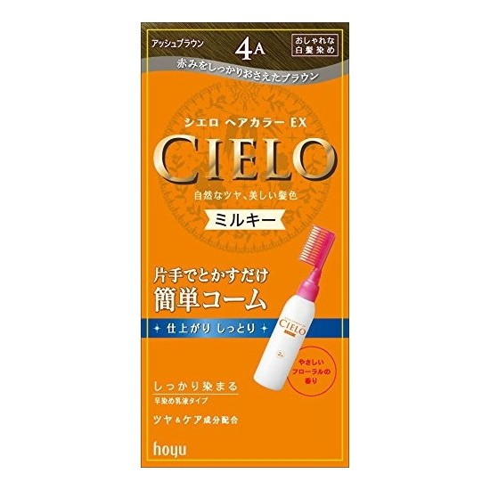 商品説明 「シエロ ヘアカラーEX ミルキー4A (アッシュブラウン)」は、片手で手早くぬれるコーム一体型乳液タイプの白髪染めです。3つの天然ツヤ成分(毛髪保護成分)と2つのケア成分(うるおい成分、毛髪保護成分)配合。髪の状態を整えながら染めるので、ツヤやかでなめらかな染め上がりに。白髪までムラなくきれいに染め上がり、色が長持ちします。どんな向きでも乳液がスムーズに出せるので、生え際や後頭部もきれいに染めることができます。やさしいフローラルの香りで気になるニオイもしっかり抑えました。仕上がりイメージは、アッシュブラウン。医薬部外品。 使用量の目安 1箱全量でセミロングヘア約(髪全体)約1回分です。 毛量の多い方は2箱ご用意ください。 分割使用 できません。残った混合乳液はすぐに洗い流して捨ててください。 使用方法 ご使用前に必ず説明書をよく読んでお使いください。 1.1剤の全量を2剤に加え、白キャップをしめ、上下に振ってよく混ぜます。 2.白キャップをはずし、コーム部につけかえます。 3.コーム部でとかすような感じで乾いた髪全体に混合乳液をムラなくぬり、15分ほど放置します。 4.よくすすぎ、シャンプー・リンスで仕上げます。 *混合乳液・すすぎ湯が目に入らないよう特に注意してください。 使用量の目安:1箱全量でセミロングヘア(肩くらいの長さ)約1回分です。毛量の多い方は2箱ご用意ください。 分割使用:できません。残った混合乳液はすぐに洗い流して捨ててください。 ●仕上がりの色調は、染める前の髪色、髪質、室温、放置時間などにより異なります。 ●白髪の量が大目の方は、仕上がりイメージより明るめに、少なめの方は暗めに仕上がります。 ●ヘアカラーやヘアマニキュアなどで染めた髪を、その色より明るく染め変えることは困難です。 使用上の注意 ●ご使用の際は必ず使用説明書をよく読んで正しくお使いください。 ●ヘアカラーはまれに重いアレルギー反応をおこすことがあります。 ●次の方は使用しないでください。 ・今までに本品に限らずヘアカラーでかぶれたことのある方 ・今までに染毛中または直後に気分の悪くなったことのある方 ・頭皮あるいは皮膚が過敏な状態になっている方(病中、病後の回復期、生理時、妊娠中等) ・頭、顔、首筋にはれもの、傷、皮膚病がある方 ●ご使用の際には使用説明書にしたがい、毎回必ず染毛の48時間前に皮膚アレルギー試験(パッチテスト)をしてください。 ●薬剤や洗髪時の洗い液が目に入らないようにしてください。 ●眉毛、まつ毛には使用しないでください。 ●幼小児の手の届かないところに保管してください。 ●高温や直射日光を避けて保管してください。 ●幼小児には使用しないでください。 ●混合乳液は、容器に入ったままで放置しないでください。ガスが発生し、容器が破裂したりあふれ出たりして、まわりを汚すおそれがあります。 成分 1剤 有効成分:塩酸2.4-ジアミノフェノキシエタノール、α-ナフトール、パラアミノフェノール、パラフェニレンジアミン、メタアミノフェノール、レゾルシン その他成分:HEDTA・3Na液、PEG(20)、POEセチルエーテル、POE(2)ラウリルエーテル、POE(21)ラウリルエーテル、アスコルビン酸、アラキルアルコール、強アンモニア水、高重合ジメチコン-1、ジグリセリン、水溶性コラーゲン液-3、ステアリルアルコール、ステアルトリモニウムクロリド、タウリン、月見草油、パラベン、ブドウ種子油、ポリ塩化ジメチルメチレンピペリジニウム液、ミツロウ、無水亜硫酸Na、ユーカリ油、ワセリン、黄203、香料 2剤 有効成分:過酸化水素水 その他成分:DPG、PG、POE還元ラノリン、POEセチルエーテル、吸着精製ラノリン、ステアルトリモニウムクロリド、セタノール、ヒドロキシエタンジホスホン酸、ヒドロキシエタンジホスホン酸4Na、フェノキシエタノール、ラノリン