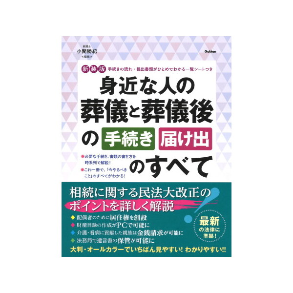 2012年に発刊された葬儀・相続についての既刊書に最新の情報を加え、見やすい大判・オールカラーでまとめた。2018年の民法大改正にも対応した内容の新装版。亡くなってから1〜2週の間に行う手続き、遺産と相続にまつわる手続きの二つのパートに分け、必要となる実務や届出について時系列で詳しく解説していていく。