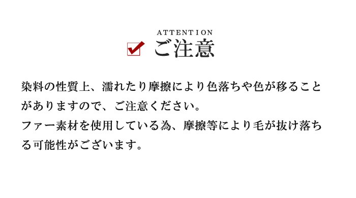 ※染料の性質上、濡れたり摩擦により色落ちや色が移ることがありますので、ご注意ください。ファー素材を使用している為、摩擦等により毛が抜け落ちる可能性がございます。