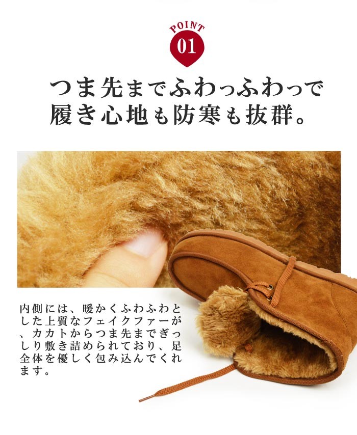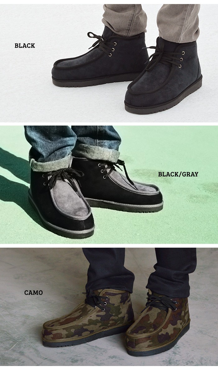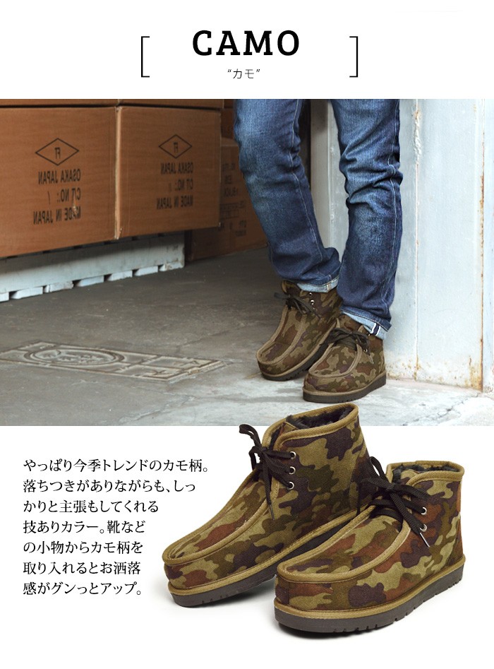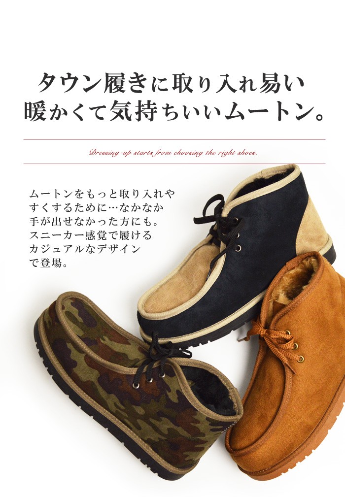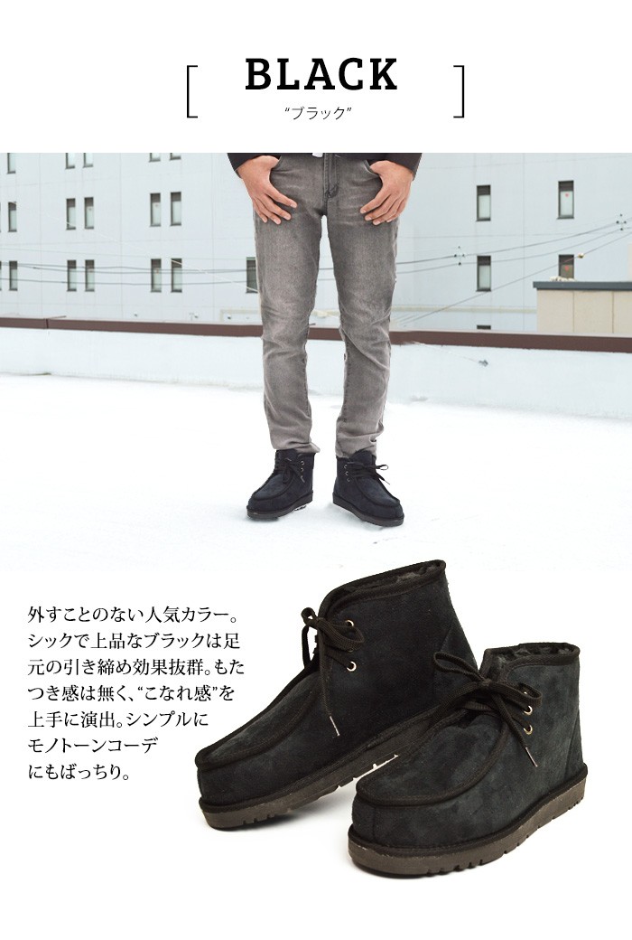タウン履きに最適!普段のコーデに取り入れやすいムートンブーツの登場。チャッカブーツやワークブーツのようなデザインなので、従来のムートンブーツよりも引き締まった印象を与えてくれます。幅の広いコーデが楽しめます。内側にはフェイクムートンがつま先からかかとと足首までぎっしり敷き詰められているので、ふわふわと履き心地も良く、しっかり防寒もしてくれます。今季愛用の一品になること間違いなしの一足です。