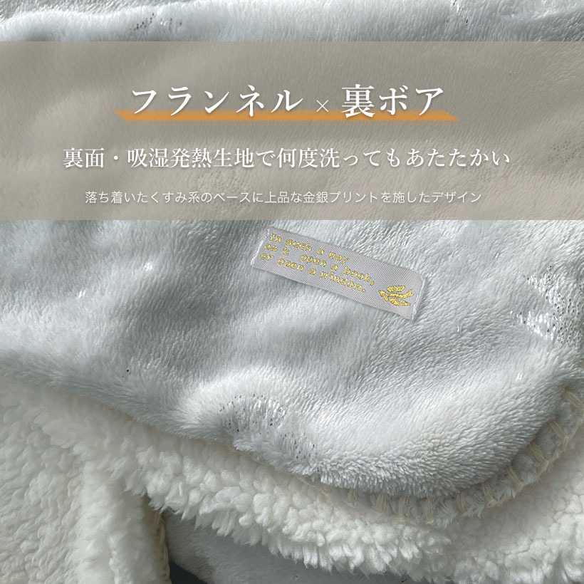 ”おうちでホテル気分”をテーマにしたシリーズ。毎日の生活を特別な気分にさせてくれる、少し高級感のあるデザインに仕上げました。たっぷり厚みのある触り心地の良いフランネル生地に、上品な金・銀のプリント。ひざ掛け・腰巻き・ポンチョとしても使える3Way。裏ボア生地には吸湿発熱糸を使用していますギフトやプレゼントにもおすすめです。