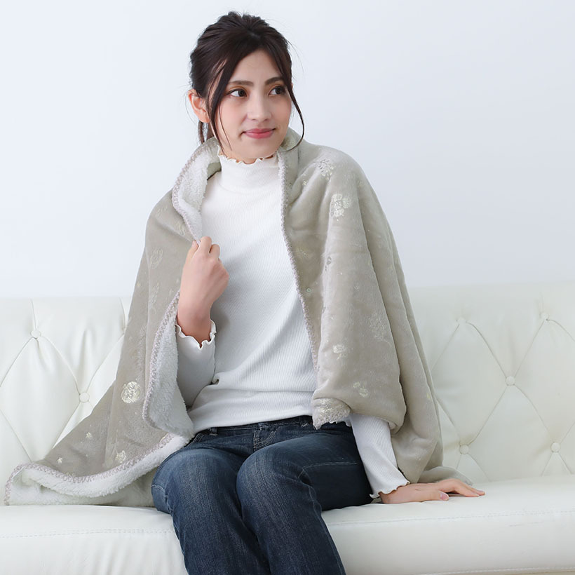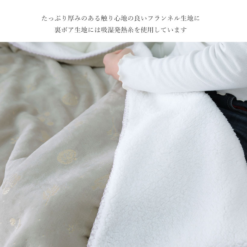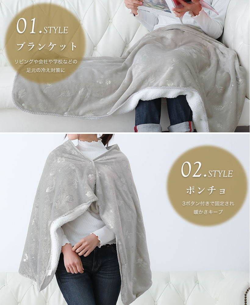 ”おうちでホテル気分”をテーマにしたシリーズ。毎日の生活を特別な気分にさせてくれる、少し高級感のあるデザインに仕上げました。 たっぷり厚みのある触り心地の良いフランネル生地に、上品な金・銀のプリント。ひざ掛け・腰巻き・ポンチョとしても使える3Way。裏ボア生地には吸湿発熱糸を使用していますギフトやプレゼントにもおすすめです。
